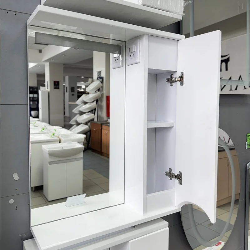 Дзеркало з шафою WIANGI Ліон LED 55, праве - це стильне та функціональне доповнення для вашої ванної кімнати. З шириною 55 см, воно підходить як для середніх, так і для великих приміщень. Дзеркало оснащене вбудованою шафою з правим розташуванням, що дозволяє зручно зберігати косметику, засоби гігієни та інші необхідні предмети. Дзеркало обладнане LED підсвіткою, вимикачем та розеткою. Вбудована підсвітка забезпечує яскраве освітлення, яке додає зручності під час догляду за собою. Завдяки стильному дизайну та практичним функціям, це дзеркало стане не лише корисним, а й елегантним елементом інтер'єру вашої ванної кімнати.