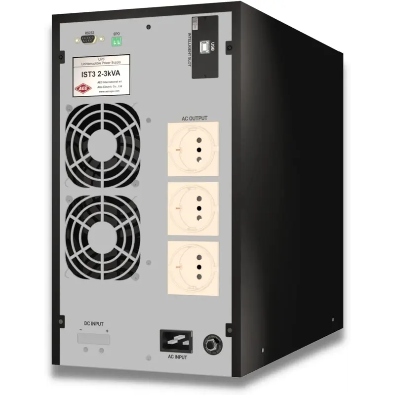 Однофазні ДБЖ IST3 (1-10 кВА) — це серія ДБЖ з подвійним перетворенням онлайн від AEC і це баштові ДБЖ з потужністю від 1 до 10 кВА. ДБЖ серії IST3 використовують найінноваційніші технології IGBT, що забезпечує ефективність до 96% і одиничний коефіцієнт вихідної потужності. ДБЖ доступні в моделях із внутрішніми батареями або в поєднанні із зовнішніми акумуляторними шафами для довшого часу роботи. ДБЖ потужністю 6 кВА та 10 кВА оснащено ручним роз’єднувачем байпаса, що забезпечує належне технічне обслуговування без переривання виходу. ДБЖ відповідає стандарту CEI 0-16.