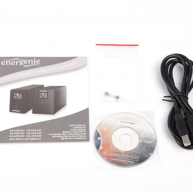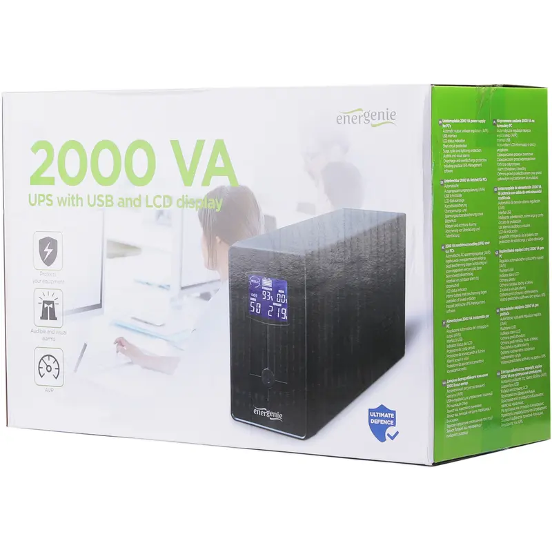 EnerGenie EG-UPS-035 2000VA — джерело безперебійного живлення, орієнтоване на безпеку даних в офісі та на вашому домашньому персональному комп'ютері. Особливості: - USB-інтерфейс для керування й індикації - РК-індикатор статусу - Захист від коротких замикань - Захист від викидів напруги, перешкод і блискавок - Звукове та візуальне сповіщення про події - Захист батареї від перезаряджання та глибокого розряджання.