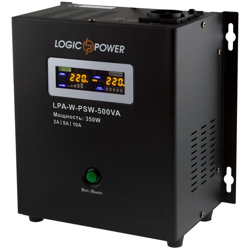 Джерело безперебійного живлення LogicPower LPA-W-PSW-500VA (350Вт)2A/5A/10A, Lin.int., AVR, 1 x евро, LCD, металл, з правильною синусоїдою 12V, настінний
