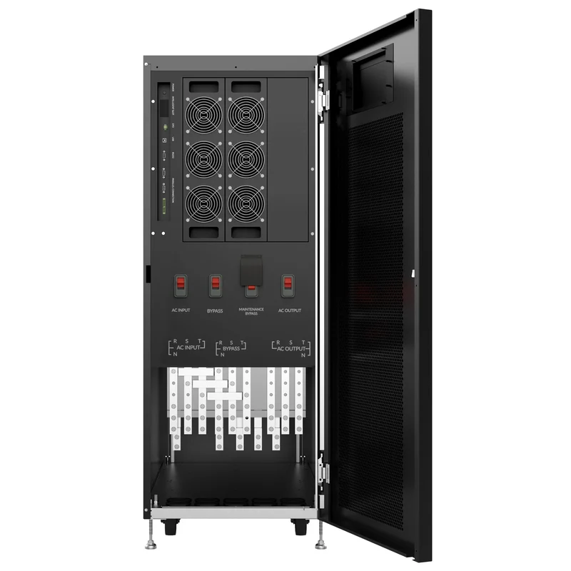 Особливості Інтелектуальний зарядний пристрій для оптимізації роботи акумуляторів Регульована конструкція батарей Додатковий ізолюючий трансформатор Технологія DSP гарантує високу продуктивність Корекція активного коефіцієнта потужності на всіх фазах Ремонтний байпас Великий сенсорний РК-дисплей з діагоналлю 7 дюймів Управління живленням через картку SNMP / Modbus / AS 400 Робота в режимі ECO для економії енергії