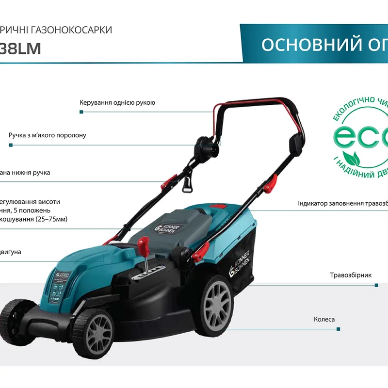Зручний важіль регулювання рівня скосу має 5 позицій, діапазон висоти зрізу від 25 мм до 75 мм, що надає можливість налаштовувати газонокосарку під індивідуальні потреби користувача та дозволяє досягати оптимального висоти газону.