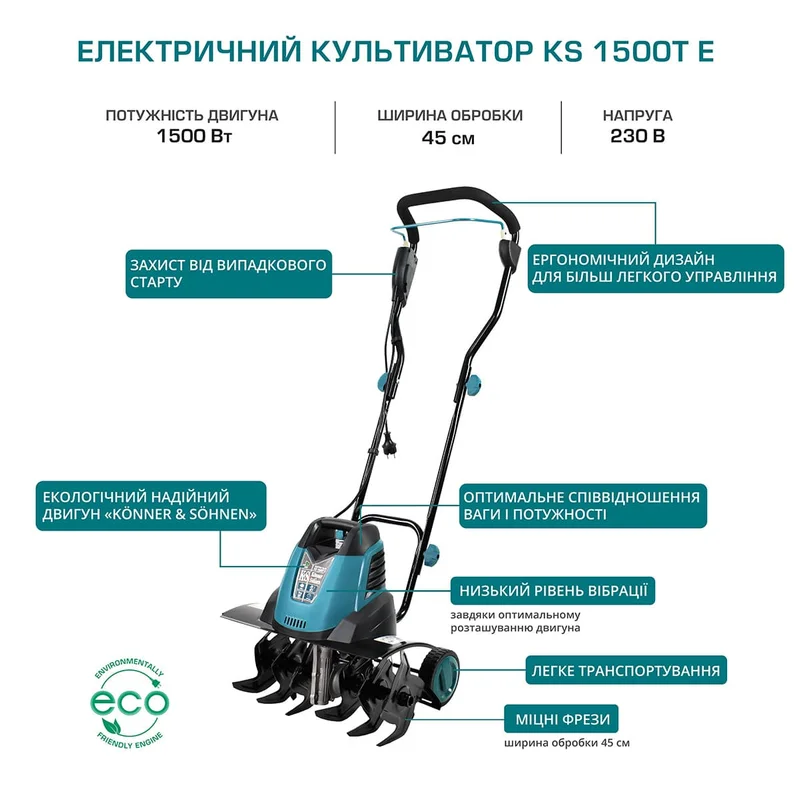 Електричні культиватори ТМ «Könner & Söhnen» оснащені потужним та надійним екологічно чистим й практично безшумним двигуном.