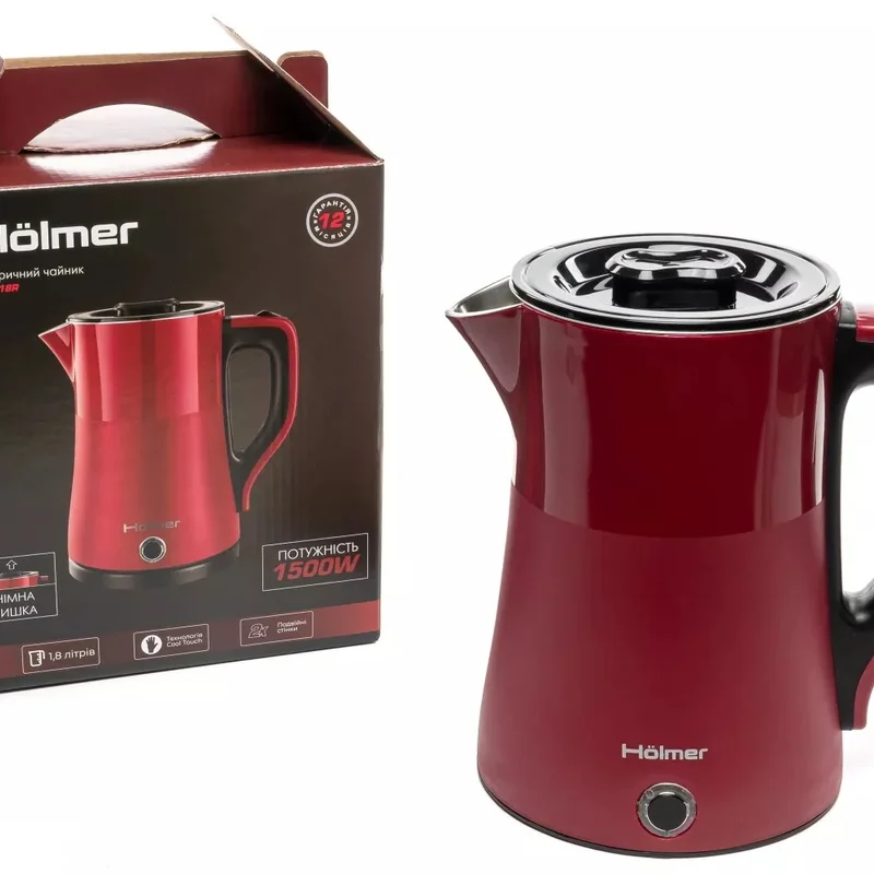 Електричний чайник Hölmer HKS-218R — це стильний і сучасний чайник з подвійними стінками, який ідеально підходить для приготування гарячої води для чаю, кави або інших напоїв. Чайник має потужність 1500 Вт і місткість 1,8 л, оснащений автоматичним відключенням при закипанні, блокуванням включення без води та технологією подвійних стінок, яка зберігає воду теплою протягом тривалого часу. Подвійні стінки Зберігають тепло всередині та залишаються холодними на дотик ззовні. Зовнішня частина виготовлена з екологічного харчового пластику, внутрішня — із безпечної нержавіючої сталі. Між ними передбачено спеціальний повітряний прошарок, це відмінно підтримує температуру води та забезпечує безпечну температуру електрочайника зовні, дає змогу економити електроенергію, а також зменшує шум під час нагрівання води. Об’єм 1,8 л Великого об’єму 1,8 л вистачить для приготування чаю або кави для вас, ваших близьких та гостей. Безпечна експлуатація Автовимкнення в разі закипання та захист від увімкнення без води роблять експлуатацію пристрою більш безпечною. А захист від перегріву забезпечить довговічність використання. Вільне обертання на 360° База живлення з поворотом на 360° дає змогу користувачам легко встановлювати чайник та обертати його. Отже, пристроєм з однаковим комфортом можуть користуватися як правші, і лівші.