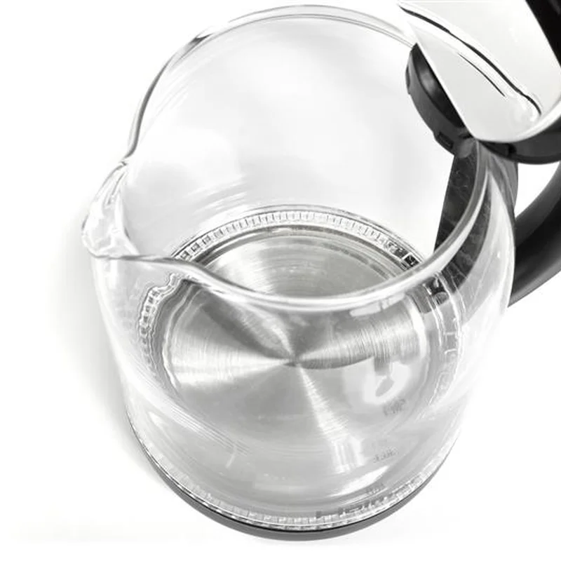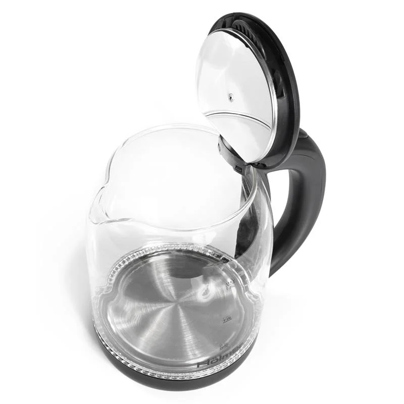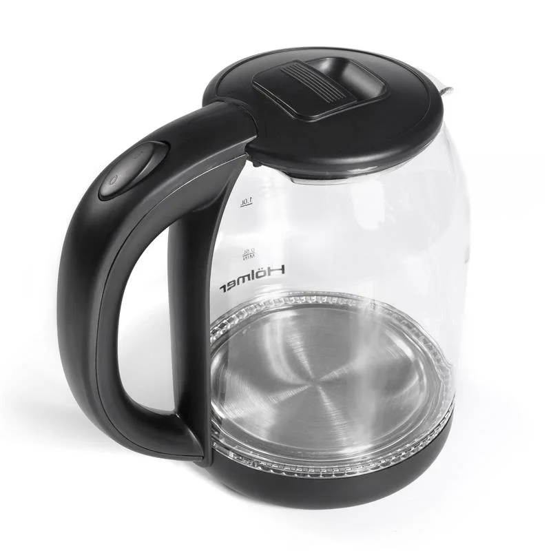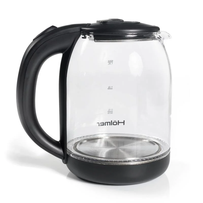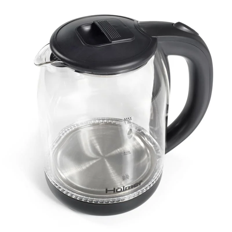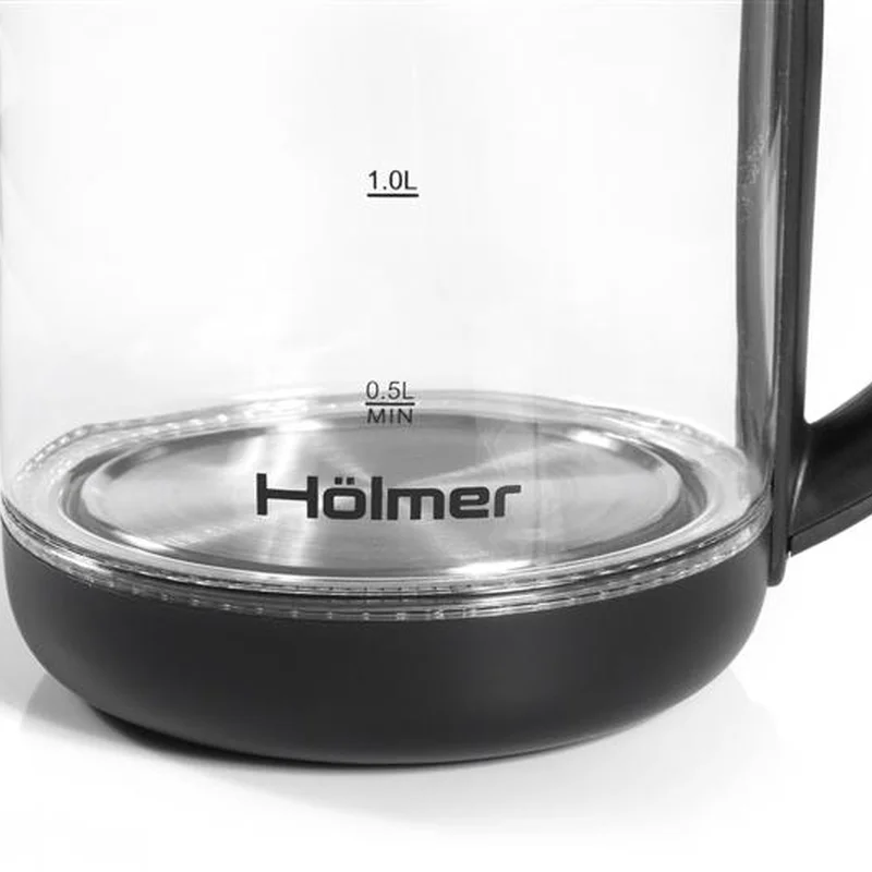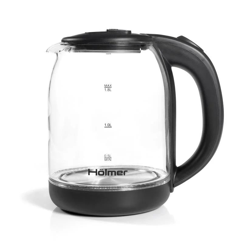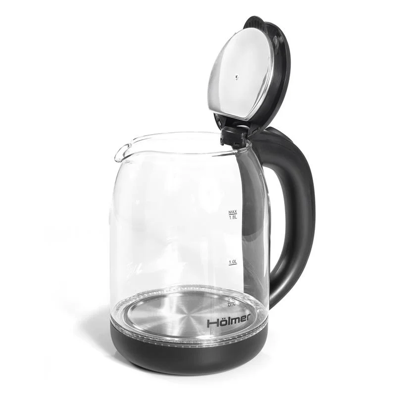 Чаша електрочайника HKS-1950 виготовлена з високоякісного термостійкого скла, об’єм складає 1.8 літра. Для зручного набору води або чищення, кришка відкривається під кутом понад 90°. Чайник Holmer HKS-1950 має чорний колір та матове покриття, а також LED – підсвічування яке сигналізує про роботу чайника та красиво і яскраво підсвічує воду блакитним кольором.