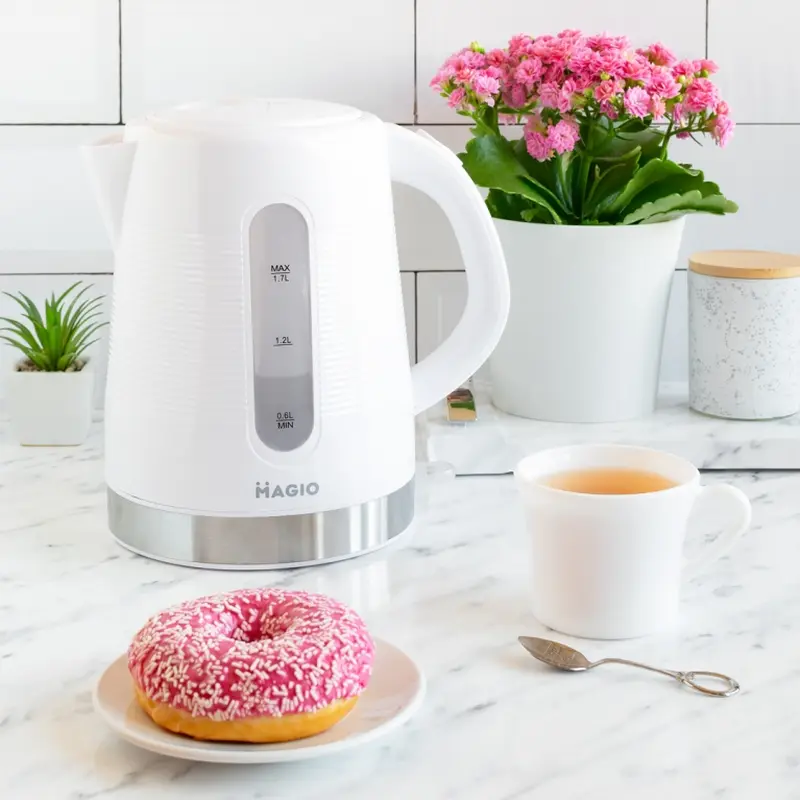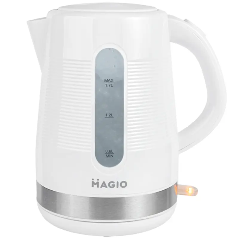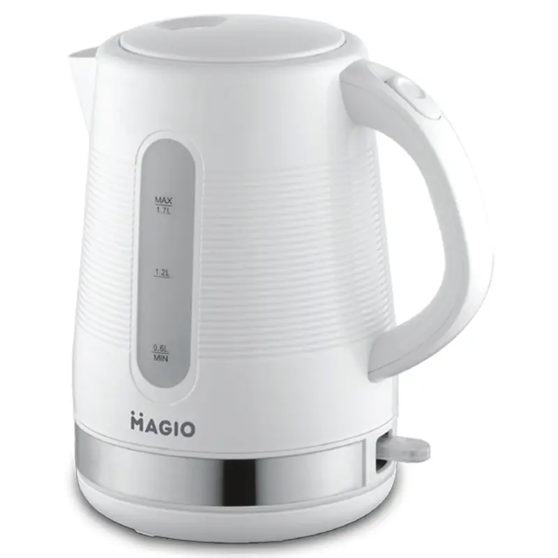 Чайник MG-100 поєднує в собі стильний дизайн із неперевершеною якістю й довговічністю. Ця унікальна модель об’ємом 1,7 л забезпечує швидке кипіння води для всієї сім’ї. Зовнішній корпус зроблений із високоякісного поліпропілену. За рахунок цього, працюючи чайник не нагрівається зовні, його температура не перевищує 70°, що виключає можливість опіків. При натисканні кнопки механізм відкриття кришки спрацьовує м’яко й плавно. Відсутнє розбризкування конденсату з кришки. Прихований нагріваючий елемент забезпечує швидке кипіння, надійність і легкість очистки чайника, а вбудований контролер захищає від перегрівання. Комплексна система безпеки запобігає короткому замиканню й викіпанню води. Функція автовимкнення активується, коли процес завершений або пристрій знімається з основи.