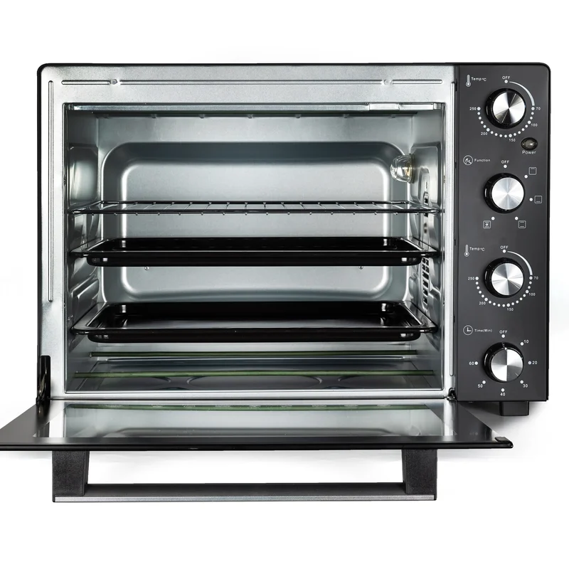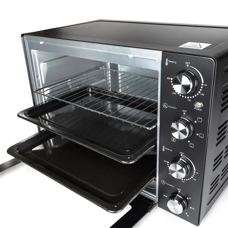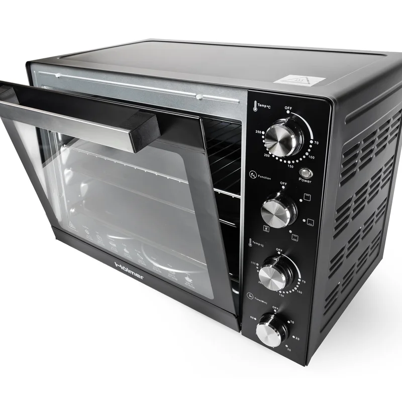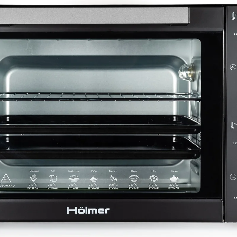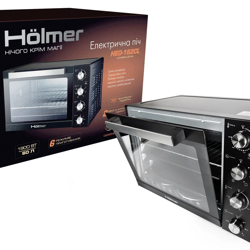 Hölmer HEO-162CL- це дуже містка модель електричної печі, із великим об'ємом камери 60 літрів й потужністю 1900 Вт. Дозволяє готувати на трьох рівнях. Оснащена внутрішнім підсвічуванням, механічним управлінням і таймером (з автовідключенням), а також, різноманітними режимами приготування на вибір: гриль, запікання, випічка. Сучасна елегантність Стильний та лаконічний дизайн Hölmer HEO-162CL доповнить ваш кухонний інтер'єр та органічно впишеться у будь-який простір. Функціональні особливості моделі та механічне управління, забезпечують просте та комфортне користування технікою, заощаджуючи ваші сили та час. Підсвічування та нагрівальні елементи Вбудована підсвітка всередині печі надасть можливість спостереження за процесом приготування. Завдяки її наявності, вам не доведеться відкривати дверцята, порушуючи температурний режим. Усередині корпусу печі, на внутрішній стінці, встановлена лампа підсвічування, яка висвітлює світлом всю камеру. Світильник стійкий до впливу високих температур і розрахований на економне споживання електроенергії. Процес випічки в печі Hölmer HEO-162CL, з функцією «підсвічування» не вимагає постійного контролю. Досить вибрати один з варіантів нагріву, необхідного для приготування страви та встановити таймер (до 60 хвилин). Варіанти нагріву: • Верхній • Нижній • Верхній + нижній • Верхній + нижній + конвекція Таймер до 60 хвилин (з автовідключенням) Hölmer HEO-162CL має механічний таймер з функцією автоматичного вимкнення. Максимальний програмований цикл становить 60 хвилин. Після закінчення встановленого періоду приготування, піч автоматично відключиться, сповістивши вас про закінчення процесу готування звуковим сигналом. Дана опція дає можливість спланувати час готування та паралельно виконувати інші завдання. Температура до 250°C На лицьовій панелі електропечі розташований механічний регулятор температури. Термостат дозволяє встановлювати температуру від 100°С до 250°С. Така можливість настройки теплового режиму дозволяє готувати страви, як при сильному нагріванні (при 250°С), так і при легкому термічному впливі. Блюда не пригорають навіть при високій температурі, бо гаряче повітря всередині печі розподіляється рівномірно. Легке очищення та безпека Користуватися моделлю HEO-162CL зручно та безпечно. Корпус печі виконаний з нержавіючої сталі, а дверцята оснащені термостійким склом. Внутрішня частина камери та дека мають антипригарне покриття, що сприяє простому очищенню техніки. Піч можна протирати вологою мочалкою або серветкою для видалення пилу. Функціональність Містка та функціональна електрична піч допоможе швидко і якісно приготувати будь-який кулінарний шедевр: соковиті овочі-гриль, запечене м'ясо, рибу або апетитну курку з ароматною хрусткою скоринкою. Вибирайте необхідний режим: гриль, випічка, або запікання та готуйте із задоволенням. Hölmer HEO-162CL дозволяє не тільки запікати, робити кулінарну випічку та готувати страви на грилі, але й розігрівати вже приготовлені. Конвекція Завдяки наявності функції «Конвекція», всередині печі створюється безперервний потік гарячого повітря, що сприяє рівномірному прогріванню та запіканню страв. Ця функція у поєднанні з верхнім або нижнім нагрівом (або комбінованим), забезпечує відмінний результат приготування. Знизу продукти не підгорають, а зверху покриваються красиво