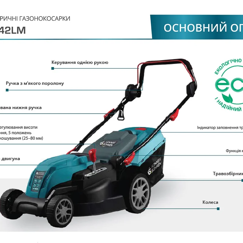 Зручний важіль регулювання рівня скосу має 5 позицій, діапазон висоти зрізу від 25 мм до 80 мм, що надає можливість налаштовувати газонокосарку під індивідуальні потреби користувача та дозволяє досягати оптимального висоти газону.