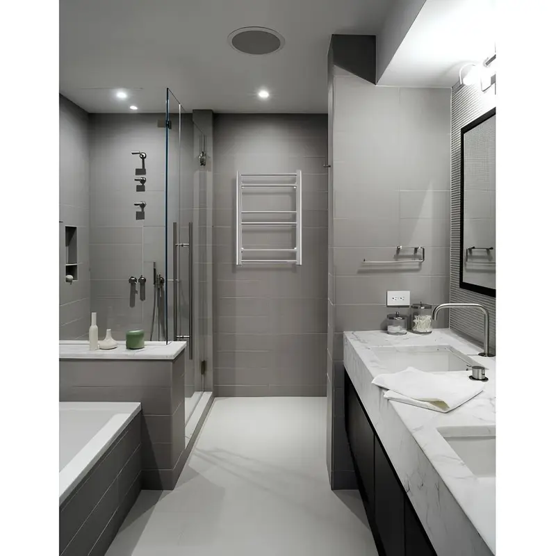 Хромова поверхня надає ванній кімнаті сучасного та елегантного вигляду. Продумана конструкція з рознесеними трубами й кронштейнами дозволяє розмістити кілька рушників одночасно.