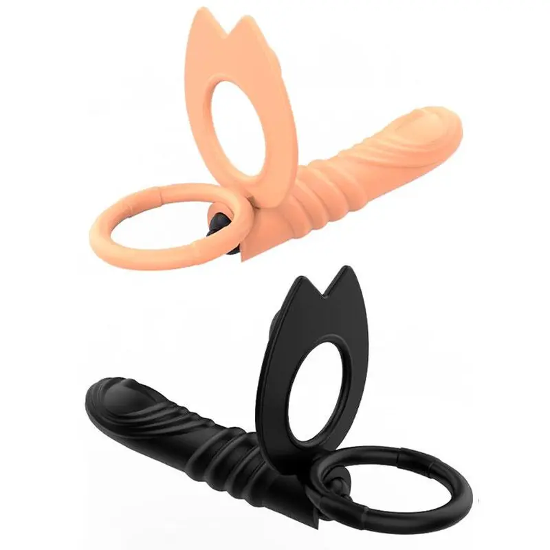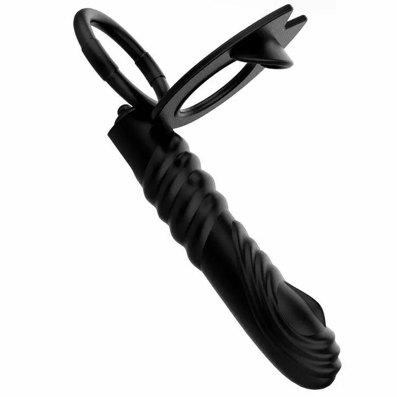 Ерекційне кільце з вібрацією і рельєфним фалоімітатором для подвійного проникнення - Чорний - Анальні іграшки