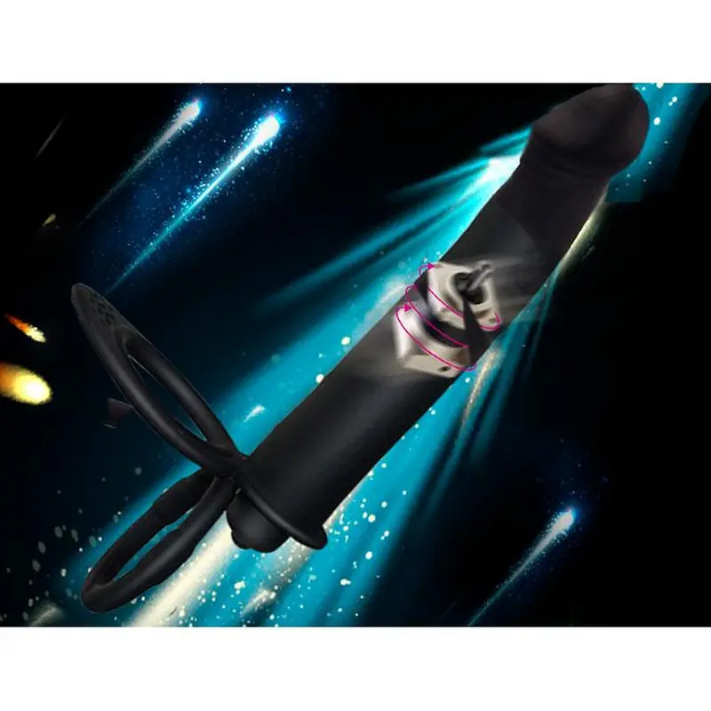 Ерекційне кільце з вібрацією і фалоімітатором для подвійного проникнення - Чорний - Анальні іграшки