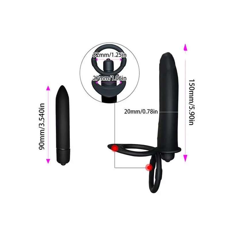 Ерекційне кільце з вібрацією і фалоімітатором для подвійного проникнення - це віброфалоімітатор, який одягається на пеніс і мошонку за допомогою кільця.Також з таким секс-аксесуаром Ви зможете забезпечити не тільки вагінальну стимуляцію, а й стимуляцію клітора і ануса!Колір: ЧорнийХарактеристика: Матеріал: Силікон Розмір: 15 см х 2 см Кількість швидкостей: 10 Рівень шуму: 50 дБ Водонепроникність: IPX7 Живлення: від 1 батарейки типу ААА Діаметр кілець 3,7 см і 2,7 см