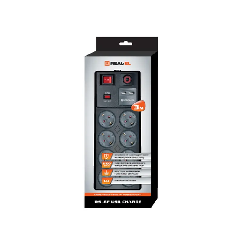 Мережевий фільтр-подовжувач REAL-EL RS-8F USB Charge з вбудованим USB зарядним пристроєм призначений для підключення до електричної мережі електроприладів і забезпечення їх захисту від високовольтних імпульсів напруги і постійної фільтрації високочастотних перешкод.Захист від грозових розрядів (блискавкозахист)Загальний двополюсний вимикач зі світловою індикацією8 розеток із заземленням і захисними шторкамиВідновлюваний запобіжник не вимагає заміни2 USB-порта для одночасної зарядки двох пристроївUSB зарядний пристрій підходить для більшості пристроївКабель з чистої міді без застосування сплавів