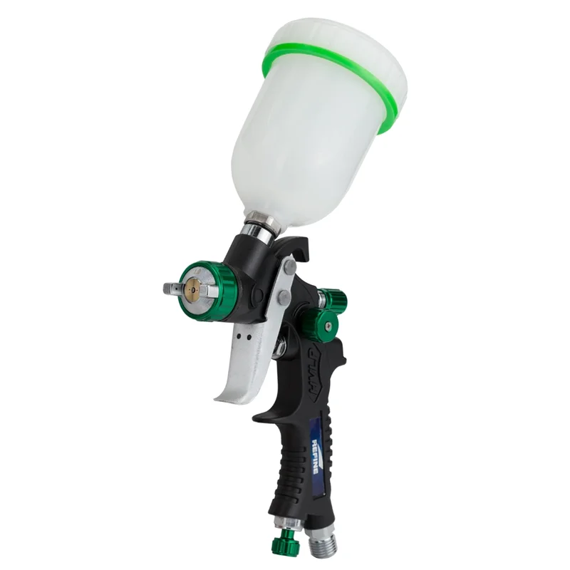 Система розпилення HVLP (High Volume, Low Pressure) - технологія високого обсягу при низькому тиску. Основна відмінність такої системи фарбопультів - це підвищена атомізація (розпорошення) лакофарбового матеріалу і стабільна форма факела при використанні. Конструкція даних фарборозпилювачів влаштована так, що завдяки спеціальній будові повітряних каналів пістолета розпилення ЛФМ відбувається при низькому тиску на виході. Фарборозпилювачі HVLP відрізняються зниженим туманоутворюванням і низькими втратами ЛФМ. Перенесення матеріалу на поверхню - понад 65%.