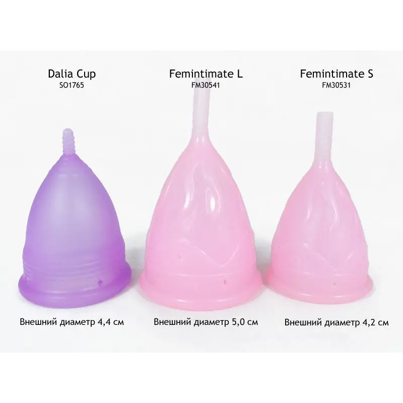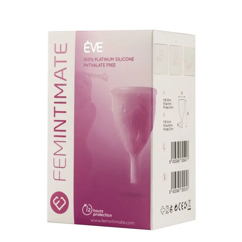 Менструальна чаша Femintimate Eve Cup може бути у двох розмірах – діаметром 32мм та 38мм (розмір S та L відповідно). Як правило, розмір чаші підбирається в прямій залежності від об'єму виділень.