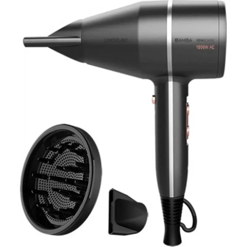 Іонний фен з дифузором, дизайн з двигуном змінного струму, великий потік, із справжніми іонами, система Perfect Color і професійні аксесуари.