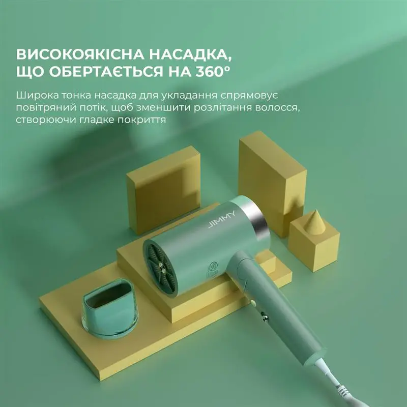 Фен для волосся з іонізацією JIMMY F2 (Mint Green) JIMMY F2 фен з цифровим двигуном та іонною технологією гарантує високу якість. JIMMY F2 має компактну та портативну конструкцію, наприклад, його можна без особливих проблем покласти у валізку, а потік повітря, який він випромінює, точний до такої міри, що дозволяє дуже швидко висихати волоссю. Потужний двигун 1800 Вт Нано-іони води живлять волосся і покращують їх якість Здоровий та низький рівень випромінювання 2-х ступінчасте регулювання швидкості повітря Високоякісна насадка, що обертається на 360° Складна конструкція Потужний двигун 1800 Вт забезпечує потужний повітряний потік. 6-листові лопаті вентилятора із потужним двигуном 1800 Вт, потужність 1.5 м.куб. великого об’єму повітря в хвилину, доставляє сильніший потік повітря для швидшого сушіння. Потужний двигун 1800 Вт Нано-іони води живлять волосся і покращують його якість. Удосконалена технологія негативних іонів, поглинає вологу з повітря і насичує волосся багатими вологою іонами, щоб зробити ваше волосся більш вологим, блискучим і шовковистим, глибоко захищаючи його від пошкоджень і тьмяності. Нано-іони води живлять волосся і покращують їх якість Негативні іони нейтралізують статичну електрику, зменшують завивання, збільшують гладкість. Генератор негативних іонів може виділяти більше 2 мільйонів одиниць/см негативних іонів на секунду, покриваючи поверхню волосся, нейтралізуючи позитивний заряд на волоссі, усуваючи статичну електрику, розгладжуючи волосся. Негативні іони нейтралізують статичну електрику Здоровий та низький рівень випромінювання, постійна температура на виході, захист вашого волосся. Фен JIMMY F2 використовує спеціальний метод намотування нагрівального дроту, ефективно забезпечує більш рівномірну та комфортну температуру на виході, запобігає нерівномірному нагріванню або перегріву та дбайливо захищає ваше волосся. Здоровий та низький рівень випромінювання Режими та настройки, що змінюються. 2-х ступінчасте регулювання швидкості повітря. Змінювані режими та налаштування Високоякісна насадка, що обертається на 360° з клямкою. Широка і тонка насадка для укладання направляє повітряний потік, щоб зменшити кількість випадаючих волосків, створює гладку поверхню, що ідеально підходить для точного укладання на вашому волоссі. Високоякісна обертова на 360° насадка із засувкою Складна конструкція - зручне зберігання та економія місця. JIMMY F2 має складний портативний дизайн, фен зручно носити із собою та зберігати, ідеально підходить для дому чи подорожей.
