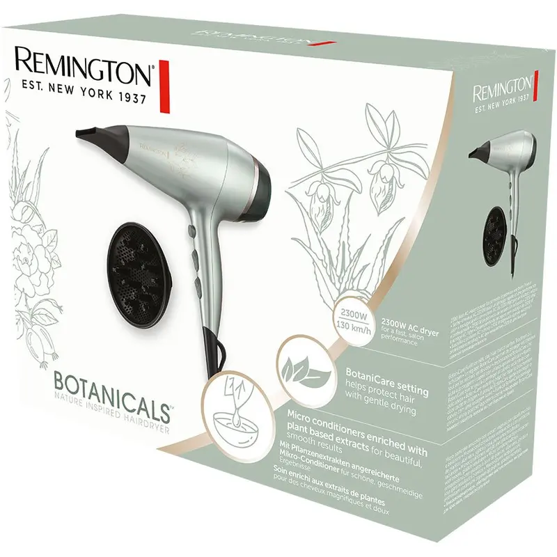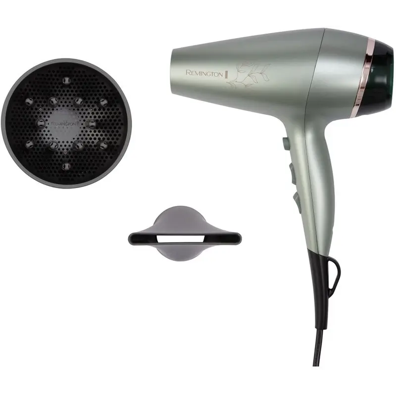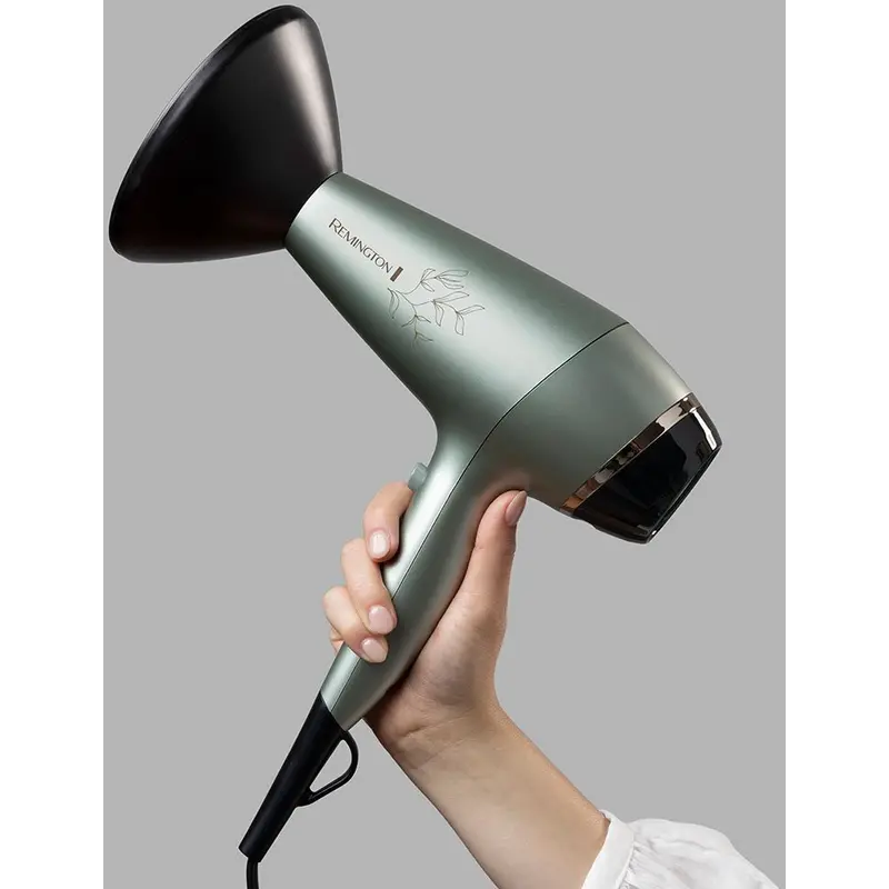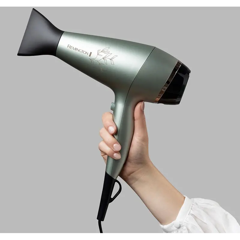 Фен Remington AC5860 Botanicals поєднує елементи, що покращують красу, знайдені в природі, а також мікрокондиціонери з алое вера, жожоба та екстрактом троянди. Ці рослинні мікрокондиціонери викидаються в повітря та доглядають за кожним пасмом, коли воно висихає. Волосся виглядає та виглядає чудово завдяки ефекту сушіння феном за нижчої температури з використанням налаштування BotaniCare. Такі насадки, як дифузор і надтонкий 6-міліметровий концентратор, допоможуть вам укласти волосся по-своєму, незалежно від того, якою версією себе ви хочете бути сьогодні.