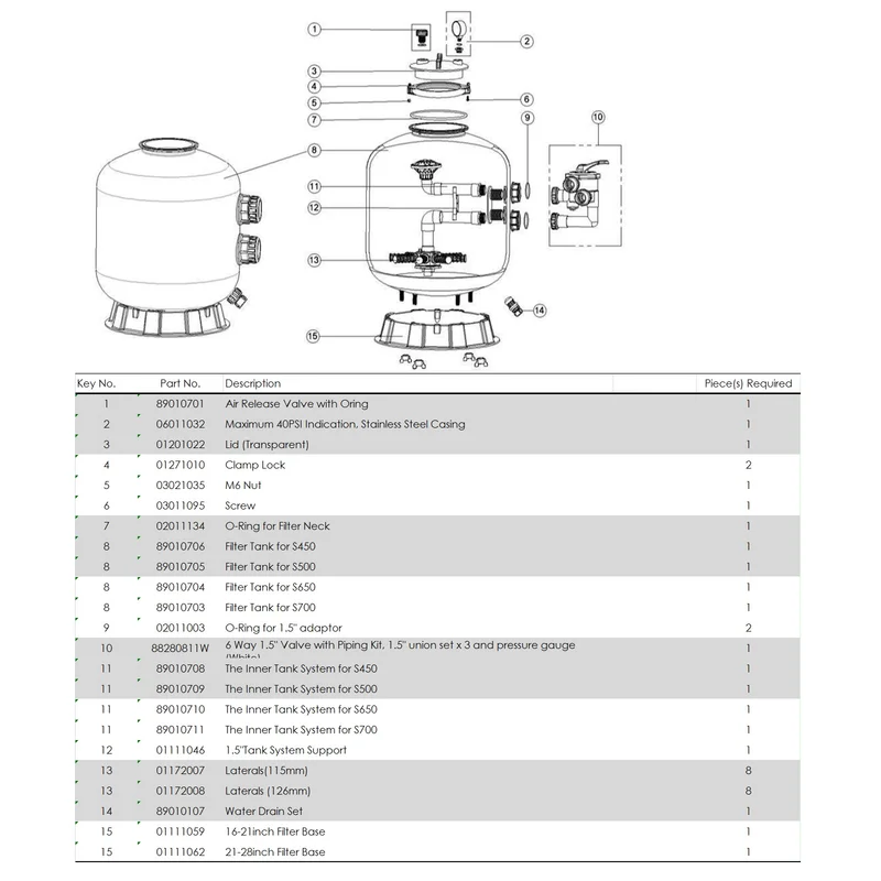 Боковий фільтр EMAUX S450 призначений для механічного очищення води в приватних басейнах та SPA. Обсяг рекомендованого басейну до 33 000 л. Корпус з пластику посиленого скловолокном. Фінішне просочення корпусу для захисту від вологи й УФ. У комплекті з боковим 6-режимним краном, муфтами, манометром. Модель збільшеної потужності. Продуктивність: 8.1 м³/годТип підключення: боковеДіаметр підключення: 1.5" (50 мм)Захист від УФ-випромінювання дозволяє фільтру працювати під сонячними променями