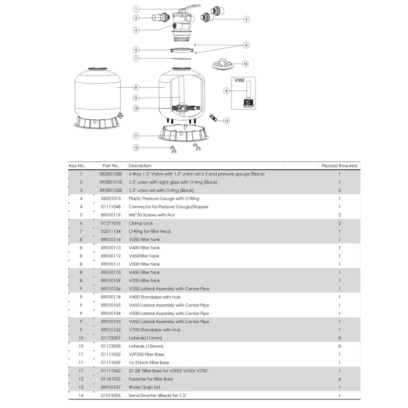 Фільтр EMAUX V450 для механічного очищення води в приватних плавальних басейнах та SPA об'ємом до 33 000 л. Місткість укріплена обмоткою зі скловолокна та оброблена спеціальним просоченням. Комплектується клапаном на 6 режимів і універсальними сполучними муфтами на 1½"(50 мм). Продуктивність: 8.1 м³/год Тип підключення: верхнє Діаметр підключення: 1-1/2"(50 мм)