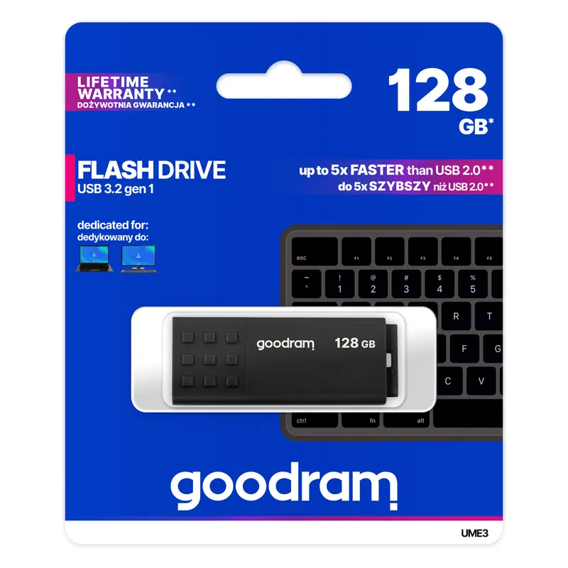 UME2 - це поєднання класичного дизайну і яскравих кольорів корпусу. Ковпачок з опуклим антиковзьким візерунком полегшує відкриття флешки в будь-якій ситуації. Знявши ковпачок, можна його прикріпити до іншого кінця корпуса - в такий спосіб не загубиться. Перфорація, яка дозволяє прикріпити шнурок, - ідеальне рішення для тих, хто любить, коли пам"ять поруч.Накопичувачі UME3 представлені моделями обсягами з 16 Гбайт по 128 Гбайт. Використовувані компоненти дозволяють досягти швидкості читання до 60 Мбайт/с і запису до 20 МБайт/с. На продукт UME3, як і на інші накопичувачі GOODRAM, надається довічна гарантія.
