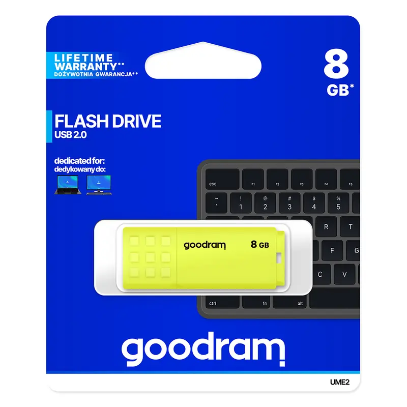 UME2 - це поєднання класичного дизайну і яскравих кольорів корпусу. Ковпачок з опуклим антиковзьким візерунком полегшує відкриття флешки в будь-якій ситуації. Знявши ковпачок, можна його прикріпити до іншого кінця корпуса - в такий спосіб не загубиться. Перфорація, яка дозволяє прикріпити шнурок, - ідеальне рішення для тих, хто любить, коли пам"ять поруч.Накопичувачі UME2 представлені моделями обсягами з 8 Гбайт по 128 Гбайт. Використовувані компоненти дозволяють досягти швидкості читання до 20 Мбайт/с і запису до 5 МБайт/с. На продукт UME2, як і на інші накопичувачі GOODRAM, надається довічна гарантія.