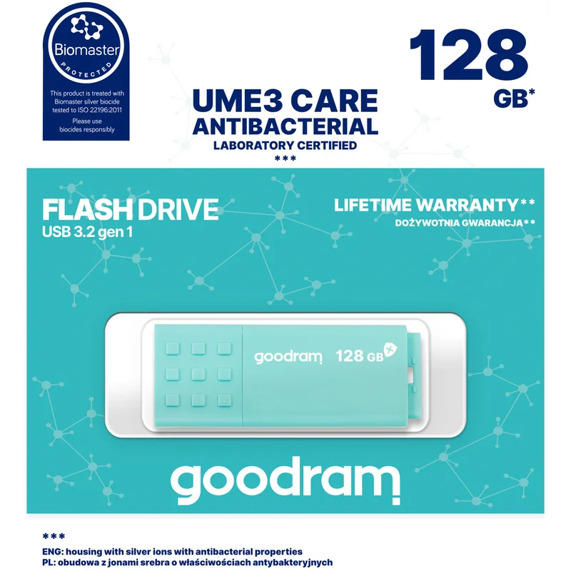 UME CARE був створений для тих, для кого безпека і гігієна є пріоритетом, особливо в офісних приміщеннях. Завдяки технології, що використовується Biomaster корпус продукту містить іони срібла з бактерицидними властивостями. Це гарантія постійного захисту протягом всього терміну служби USB-накопичувача. Антибактеріальні властивості продукту підтверджені лабораторними дослідженнями. Уже через 24 години кількість мікроорганізмів на поверхні UME CARE зменшується до 99%.