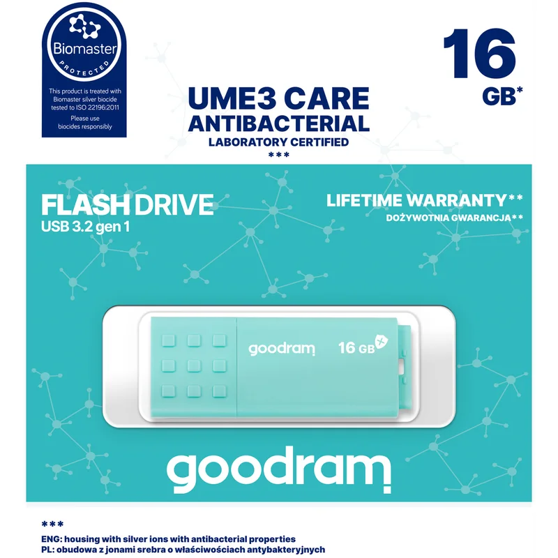 UME CARE був створений для тих, для кого безпека і гігієна є пріоритетом, особливо в офісних приміщеннях. Завдяки технології, що використовується Biomaster корпус продукту містить іони срібла з бактерицидними властивостями. Це гарантія постійного захисту протягом всього терміну служби USB-накопичувача. Антибактеріальні властивості продукту підтверджені лабораторними дослідженнями. Уже через 24 години кількість мікроорганізмів на поверхні UME CARE зменшується до 99%.