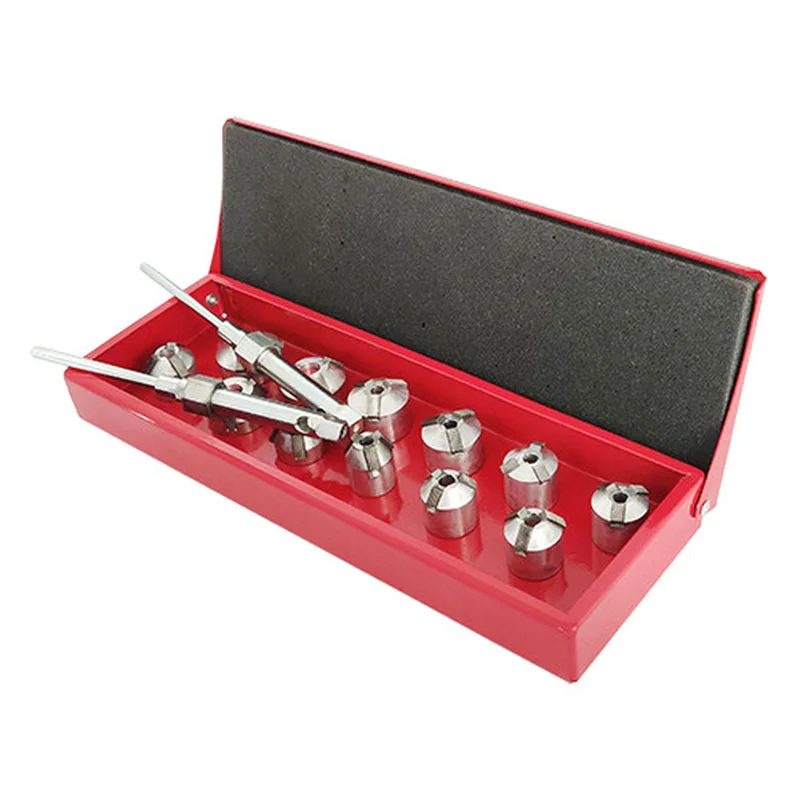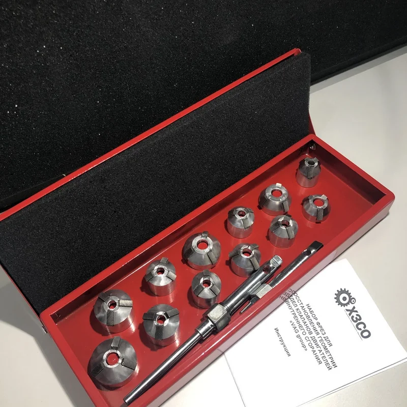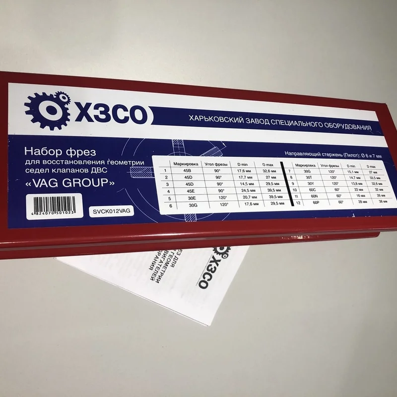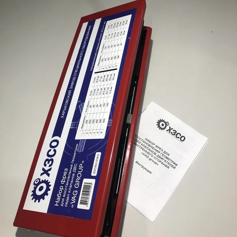 Набір фрез для відновлення геометрії сідел клапанів ДВС "VAG group" (ХЗСО) SVCK012VAG Даний набір фрез (шарошок) призначений для відновлення геометрії сідел клапанів двигунів внутрішнього згоряння автомобілів.Фрези мають в своїй конструкції ріжучі ножі з фіксованим положенням, тобто нерегульовані положення відносно корпусу фрези.Конструкция и размеры фрез позволяют обрабатывать седла клапанов, обеспечивая значения углов и диаметров согласно рекомендаций завода изготовителя двигателя.Производитель набора фрез гарантирует, что при соблюдении всех условий инструкции, режущий инструмент прослужит длительный срок и принесет максимальную прибыль. Перед началом использованием фрез необходимо ознакомится с данной инструкцией. Комплектность набора фрезНабор состоит из режущего инструмента – фрез (шарошек), с различными диаметрами и углами, а также направляющего стержня (пилота). Набор фрез позволяет обрабатывать фаски седел клапанов, автомобилей семейства VAG group обеспечивая следующие углы, рекомендованные заводом изготовителем:A 45º, B 30º, C 30º Характеристики:Диапазон обрабатываемых диаметров сёдел клапанов:17.6-32.6, 17.7-27, 14.5-29.5, 24.5-39.5, 17.6-29.5, 15.1-27, 14.7-33.5, 13.8-32.6, 22-32, 16-26, 28-38 ммУглы фрез:60º, 90º, 120ºДиаметр направляющего стержня (пилота):6, 7 мм Обозначение фрезыДиапазон обрабатываемых седел клапановУгол фрезыДиаметр направляющего стержняФреза 45B17.6-32.6 мм90°6, 7 ммФреза 45D17.7-27 мм90°Фреза 45D14.5-29.5 мм90°Фреза 45E24.5-39.5 мм90°Фреза 30E20.7-39.5 мм120°Фреза 30G17.6-29.5 мм120°Фреза 30G15.1-27 мм120°Фреза 30T14.7-33.5 мм120°Фреза 30Y13.8-32.6 мм120°Фреза 60C22-32 мм60°Фреза 60N16-26 мм60°Фреза 60P28-38 мм60° Комплектація:Фреза 30T 120º Фреза 30E 120º Фреза 30G 120º (2 шт.) Фреза 30Y 120º Фреза 45E 90º Фреза 45B 90º Фреза 45D 90º (2 шт.) Фреза 60P 60º Фреза 60C 60º Фреза 60N 60º Направляючий стержень (пілот) діаметром 6 мм з гайкою Направляючий стержень (пілот) діаметром 7 мм з гайкою