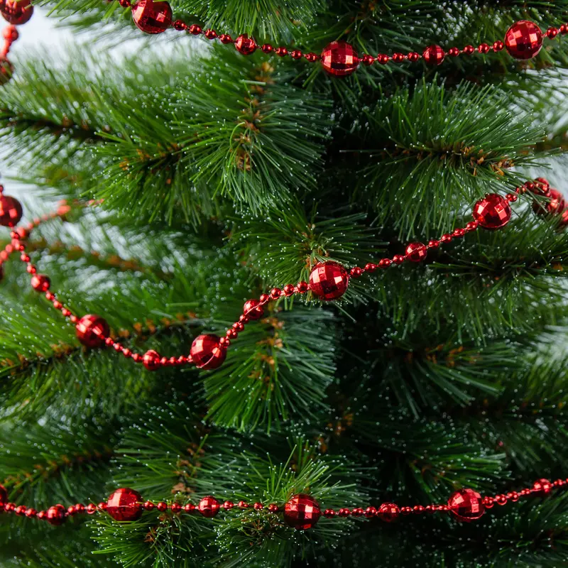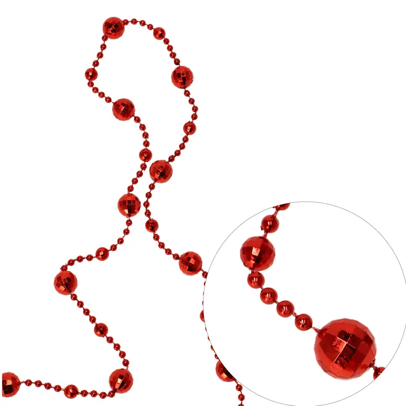 Оригінальний варіант оздоблення — привабливі декоративні буси. Гірлянда яскравого червоного кольору з глянцевих намистинок у поєднанні з акцентними рельєфними намистинами середнього та більшого розміру стане чудовою прикрасою вашого новорічного дерева, або як доповнюючий елемент декору у святковому інтер'єрі.