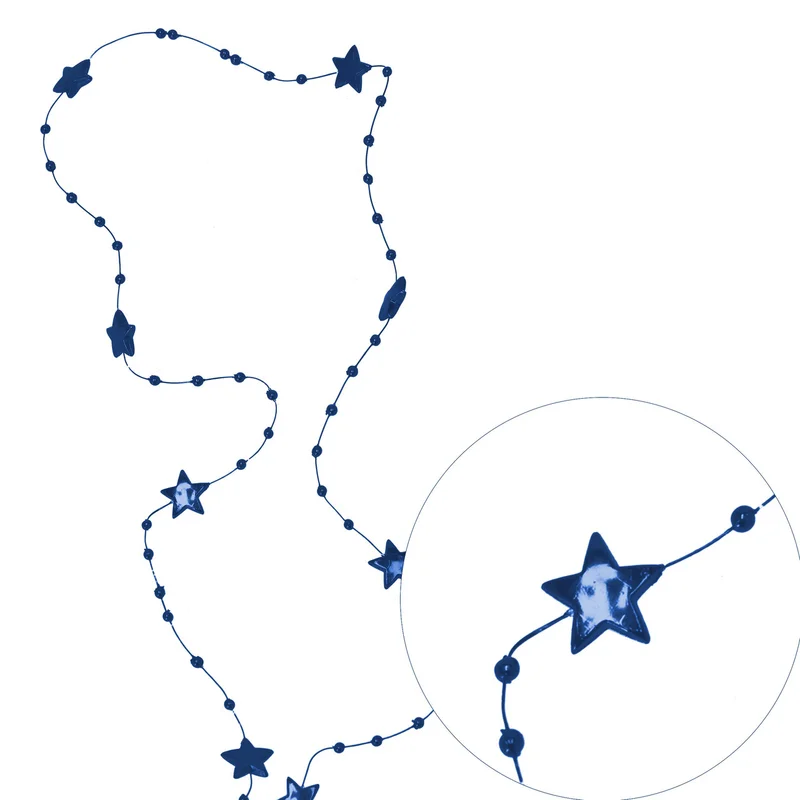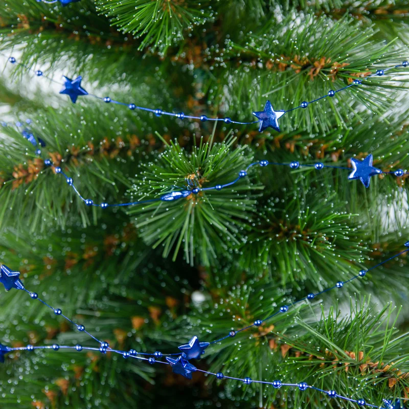 Оригінальний варіант оздоблення — привабливі декоративні буси. Гірлянда стилього синього кольору з глянцевих намистинок у поєднанні з акцентними зірочками стане чудовою прикрасою вашого новорічного дерева, або як доповнюючий елемент декору у святковому інтер'єрі.