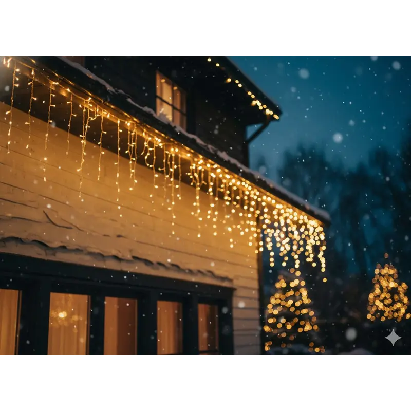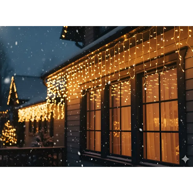 Гірлянда Chomik типу "Бахрома" з 300 теплими білими світлодіодами — це елегантне рішення для святкового освітлення фасадів, вікон або декоративних зон як у приміщенні, так і на вулиці. Основна частина гірлянди має довжину 12 метрів, на якій розміщені світлодіоди з рівномірним кроком 10 см, а звисаючі нитки створюють візуальний ефект світлової водоспаду. Ще 3 метри припадає на з'єднувальний кабель без ламп, що робить монтаж особливо зручним. Завдяки живленню від мережі 230V і класу захисту IP44 ця модель підходить для довготривалого використання в умовах підвищеної вологості.Особливості• Загальна довжина гірлянди 15 м включає 12 м світлової частини та 3 м з'єднувального кабелю, що дає змогу комфортно розмістити її навіть на великій площі.• Світлодіоди теплого білого кольору розміщені з кроком 10 см, створюючи щільне світлове полотно без затемнень.• Звисаючі нитки з кроком 20 см додають об’єму і динаміки, надаючи гірлянді ефекту водоспаду чи танцюючих крапель.• Сріблястий мідно-пластиковий дріт зберігає гнучкість і стійкість, водночас виглядає стильно на тлі фасадів або інтер’єрних елементів.• Клас захисту IP44 гарантує безпеку використання в умовах підвищеної вологості — наприклад, на балконах, верандах або біля вікон.Варіанти використання• Ідеальна для декорування карнизів, вікон або фасадів будинку, де бахрома створює святковий і гармонійний акцент.• Використовується у створенні фотозон або сценічного оформлення, де потрібне інтенсивне, але м’яке світло.• Може прикрашати арки, балкони або зовнішні конструкції під навісом, додаючи виразності вуличному святковому оформленню.• Підходить для інтер’єрного декору віталень, ресторанів, торгових залів або віконних вітрин у святковий період.• Добре комбінується з текстильним або природним декором: гірлянда легко переплітається з гірляндами з хвої, гілок або мішури.*Реальний колір товару може дещо відрізнятись від зразків, представлених на сайті, в залежності від технічних налаштувань Вашого екрану, а також, враховуючи особливості матеріалу, відтінок товару може змінюватись в залежності від освітлення.