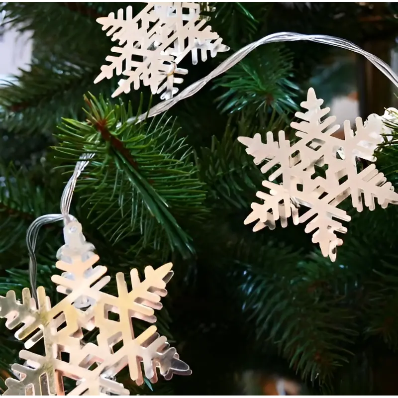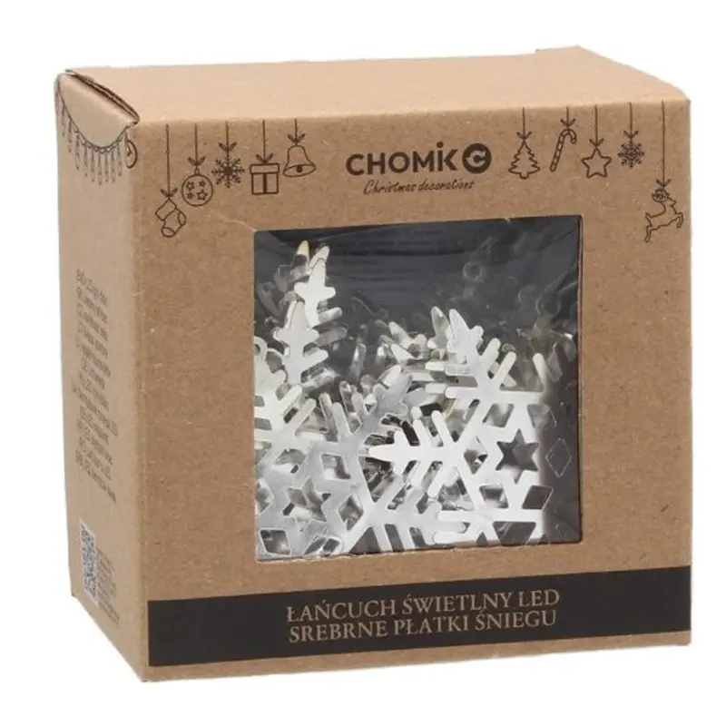 Гірлянда Chomik з перламутровими сніжинками — це стильне поєднання зимової тематики та благородного блиску металу, яке надає інтер’єру вишуканого святкового настрою. Кожна фігурка виконана у формі витонченої сніжинки з перламутровим ефектом, що переливається при світлі теплих LED-ламп. Завдяки сріблястому мідному дроту та автономному живленню від трьох батарейок AA гірлянда зручна у використанні та легко інтегрується в різні декоративні композиції. Її довжина складає 1,65 м, що дозволяє ефективно декорувати невеликі простори, створюючи атмосферу тепла та зимової казки.Особливості• Металеві сніжинки діаметром 6 см мають привабливий перламутровий блиск, який ефектно відображає світло і створює глибину та об’єм у декорі.• Світлодіоди з теплим білим відтінком розміщені на відстані 15 см один від одного, що забезпечує рівномірне, м’яке освітлення.• Сріблястий гнучкий дріт дозволяє створювати довільні фігури або обвивати предмети інтер’єру, не порушуючи загальної естетики.• Статичне світіння підходить для створення спокійної святкової атмосфери без нав’язливого мерехтіння.• Живлення від батарейок 3×AA забезпечує стабільну роботу без прив’язки до джерела електрики, що особливо зручно у мобільному декоруванні.Варіанти використання• Використовується для прикрашання вікон, гірлянд на стінах або декоративних арок, де сніжинки виглядають ефектно завдяки металевому блиску.• Ідеально підходить для оздоблення новорічного столу, дзеркал або декоративних композицій на каміні.• Може слугувати стильним освітленням у спальнях чи дитячих кімнатах, де потрібне м’яке підсвічування.• Ефектно виглядає в святкових фотозонах або зимових декораціях у кафе, магазинах чи салонах краси.• Добре поєднується з іншими святковими елементами, зокрема скляними іграшками, деревом або текстилем у холодних відтінках.* Реальний колір товару може дещо відрізнятись від зразків, представлених на сайті, в залежності від технічних налаштувань Вашого екрану, а також, враховуючи особливості матеріалу, відтінок товару може змінюватись в залежності від освітлення.