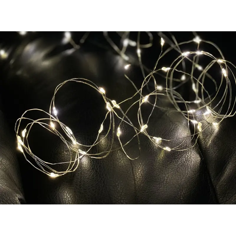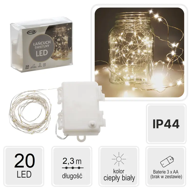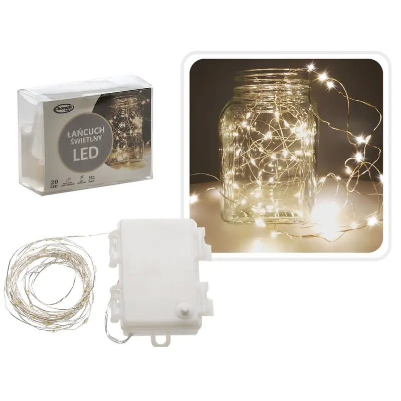Гірлянда-струна польського бренду Chomik із теплим білим кольором світіння буде цікавим акцентом на вашому новорічному дереві або як доповнюючий елемент декорування інтер'єру. Відрізняється підвищеною яскравістю, надійністю та довговічністю.Оскільки джерелом живлення є батарейки, гірлянда з 20 LED-лампочками, що невагомо виблискують на тоненькому сріблястому дроті, з легкістю знайде своє місце у межах ваших креативних рішень зі створення затишної різдвяної атмосфери. Також слугуватиме гарним додатковим джерелом світла.Новорічна гірлянда - це не тільки класична ялинкова прикраса, а в першу чергу чарівна гра яскравих LED вогників, які подарують вам святковий настрій, тепло, затишок, приємні емоції, наповнивши інтер'єр світлом і атмосферою казкового Нового Року.