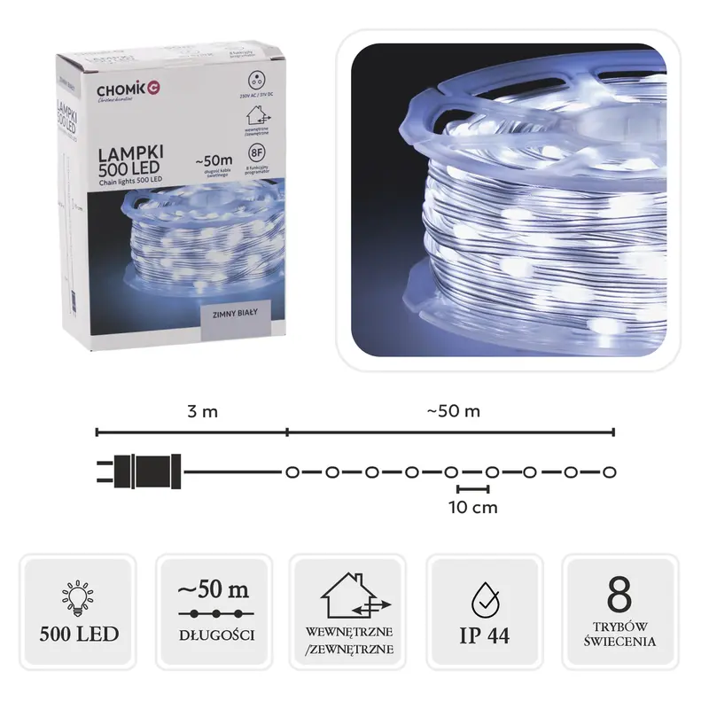 Гірлянда-струна на котушці польського бренду Chomik 49,9+3 м із холодним білим кольором світіння матиме чудовий вигляд на вашому новорічному дереві, додасть чарівного блиску інтер'єру, а також слугуватиме гарним додатковим джерелом світла. Ніжне, але виразне світло 500 LED-лампочок нагадує мерехтливі золоті іскри, що сяють в невагомості, завдяки чому кожен прикрашений ними простір набуває казкового, різдвяного характеру.Серед інших переваг гірлянди-струни Chomik:• 8 режимів світіння (безперервний, мерехтіння, повільне згасання, погоня, повільне світіння, послідовності, хвилі, комбінації)• таймер• зручна котушка для зберігання та користування• ідеально підходить для прикрашання ялинки чи як додатковий елемент декоруванняЧисленні світлодіоди та можливість вибору режимів світіння дозволяють легко налаштувати освітлення відповідно до індивідуальних уподобань та настрою. Лампи, завдяки світлодіодній технології, є енергоефективними, що дозволяє їм світитися протягом багатьох годин без суттєвого споживання енергії.Новорічна гірлянда - це не тільки класична ялинкова прикраса, а в першу чергу чарівна гра яскравих LED вогників, які подарують вам святковий настрій, тепло, затишок, приємні емоції, наповнивши інтер'єр світлом і атмосферою казкового Нового Року.*Реальний колір товару може дещо відрізнятися від зразків представлених на сайті залежно від технічних налаштувань Вашого екрану, а також, зважаючи на особливості матеріалу, відтінок товару може змінюватися залежно від освітлення.
