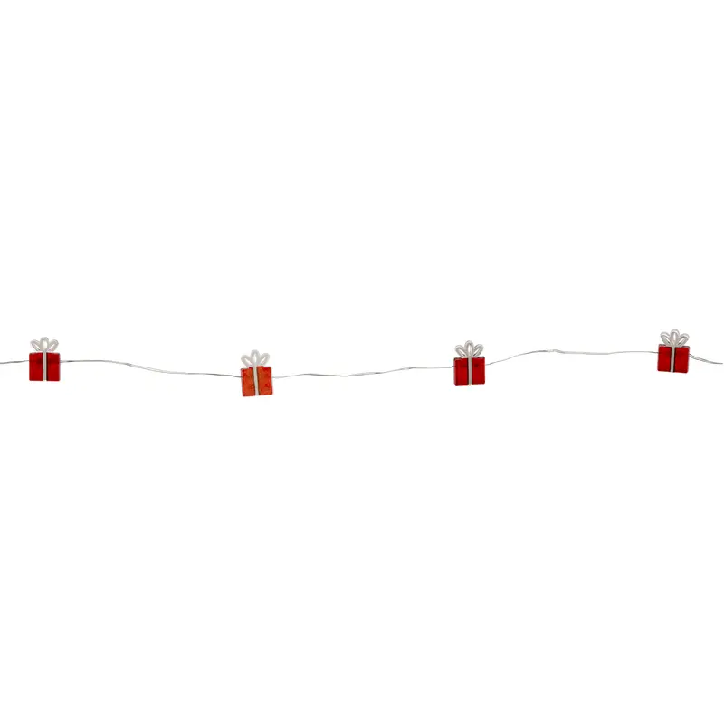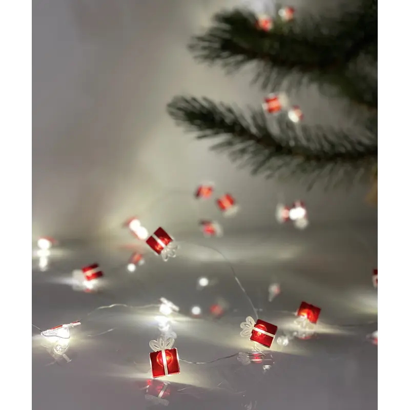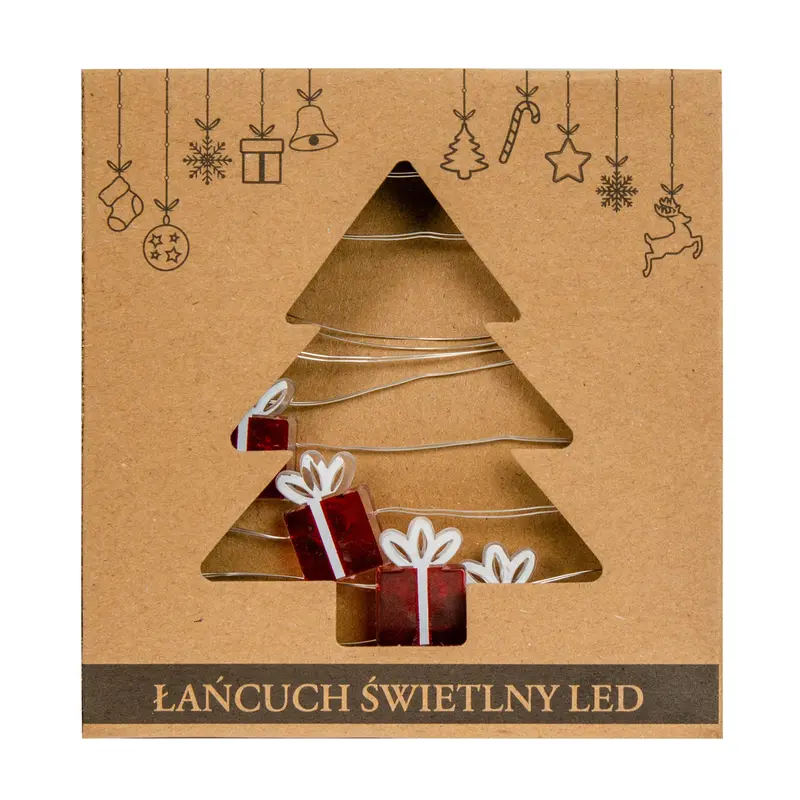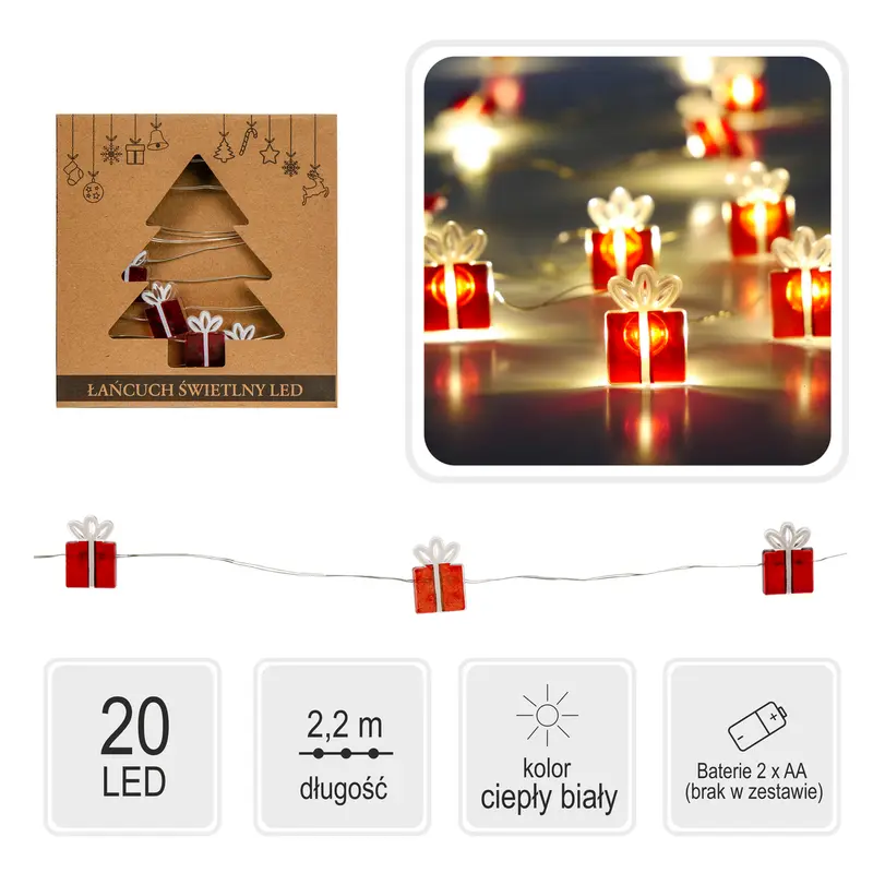 Гірлянда-струна "Подарунок" польського бренду Chomik із теплим білим кольором світіння буде цікавим акцентом на вашому новорічному дереві або як доповнюючий елемент декорування інтер'єру. Відрізняється м'яким статичним світлом, надійністю та довговічністю. Тендітні червоні фігурки у вигляді святкових подарунків додають виробу особливої казковості та урочистості. Оскільки джерелом живлення є батарейки, гірлянда з милими подаруночками з легкістю знайде своє місце у межах ваших креативних рішень зі створення затишної різдвяної атмосфери.Новорічна гірлянда - це не тільки класична ялинкова прикраса, а в першу чергу чарівна гра яскравих LED вогників, які подарують вам святковий настрій, тепло, затишок, приємні емоції, наповнивши інтер'єр світлом і атмосферою казкового Нового року.