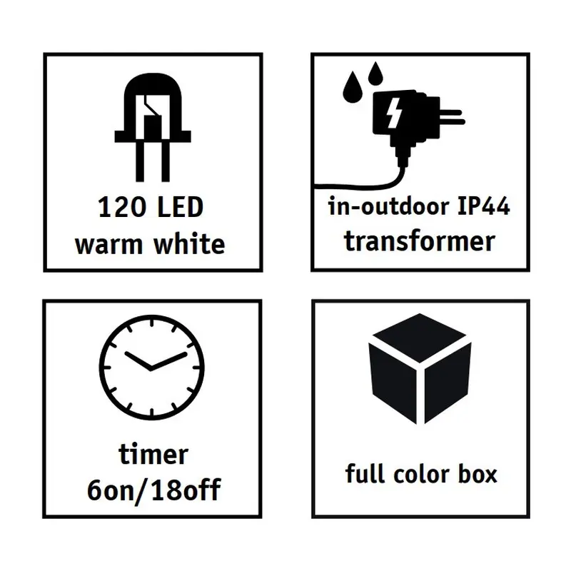 120 сяючих LED лампочок забезпечать різноманіття вражень та емоцій від святкової прикраси. Зелений дріт гірлянди залишається майже непомітним на різдвятому дереві, що викликає ефект невагомості LED-вогників. Відрізняється підвищеною яскравістю, надійністю та довговічністю. Обладнана таймером, при задіюванні якого, після 6 годин безперервної роботи вимикається на 18 годин.