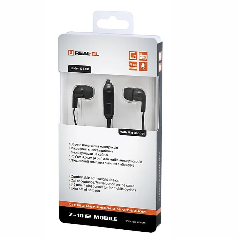 Особливості: Зручна полегшена конструкція Мікрофон та кнопка прийому дзвінка/паузи на кабелі Додатковий комплект змінних амбушюрів Навушники з мікрофоном Real-El Z-1012 Mobile призначені для роботи із сумісними з ними системами (портативними програвачами, ПК, телефонами тощо). Їх також можна використовувати в інтернет-телефонії, під час проведення відеоконференцій, для розпізнавання мови та навчання іноземних мов.