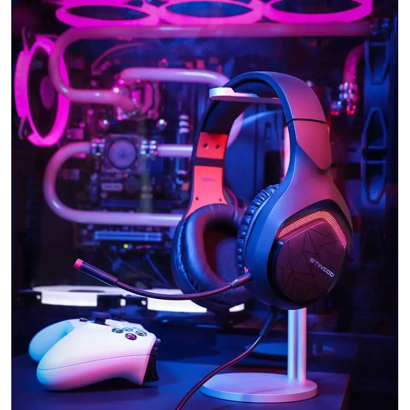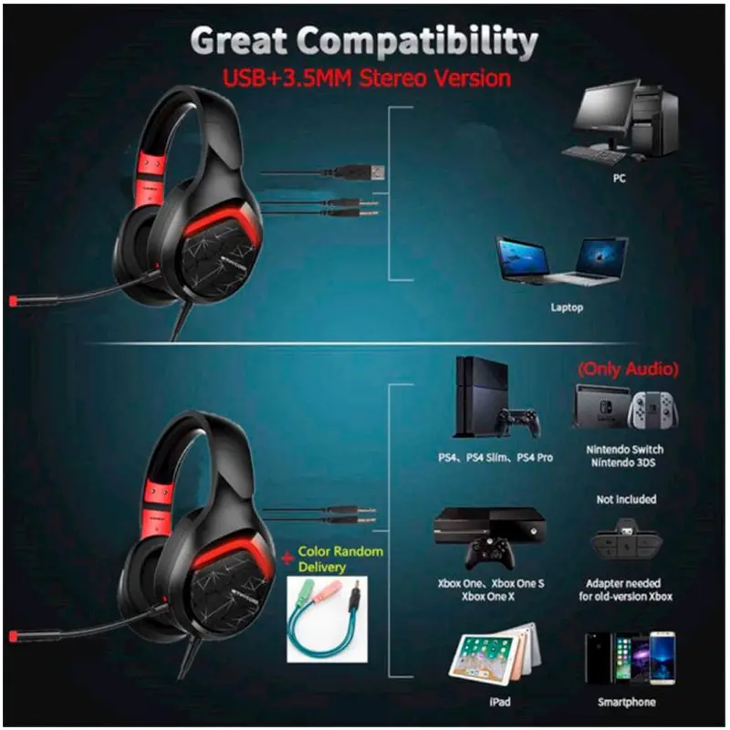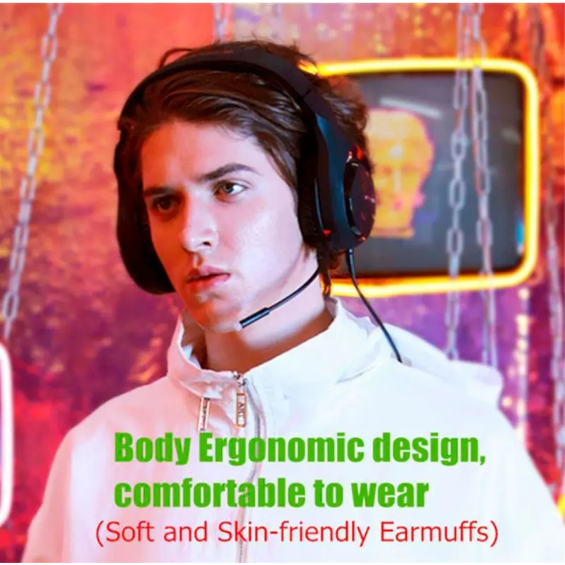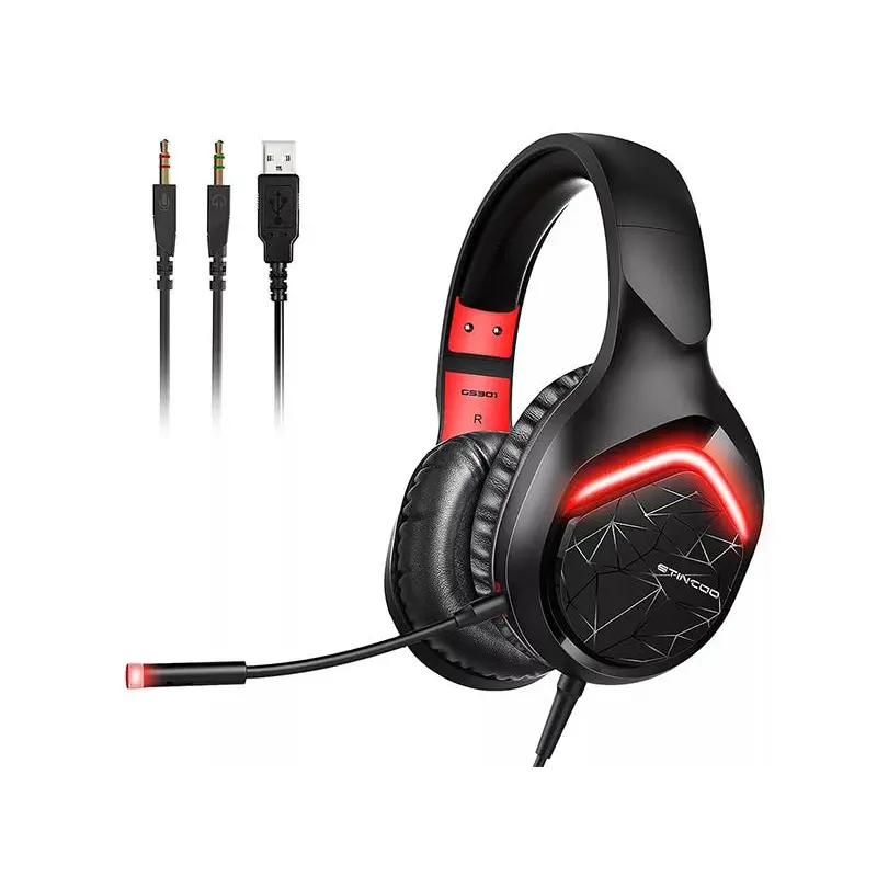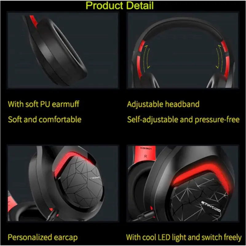 Особливості: 1. Подвійний режим, можна легко змінити режим гри/звуку. 2. Навушники мають багатокутний дизайн, зі світлодіодним підсвічуванням. 3. З легкою конструкцією немає тиску для тривалого носіння. 4. Мікрофон можна легко зігнути, він може вловлювати звук із навколишнього середовища. GS301 розроблений зі світлодіодним підсвічуванням, щоб покращити ваші враження від гри. Підходять для великих розмірів голови, щоб забезпечити зручність носіння. Крім того, він розроблений для тривалих ігрових сесій. Приємні для шкіри великі амбушюри, що дихають, м'які, але збережуть форму. Включаючи мікрофон з шумозаглушенням, тому ваш тимейт може бути чути голосно і чітко, не відволікаючись на шум фону.