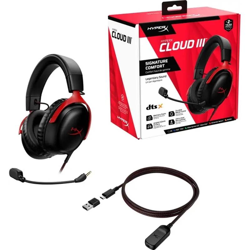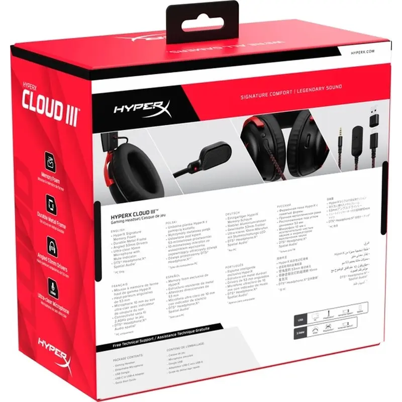Лінійка геймерських гарнітур HyperX Cloud стала легендарною завдяки фірмовому комфорту та увазі до деталей, які чітко простежуються і в Cloud III. Крім того, гарнітура оснащена модернізованими 53-міліметровими драйверами, розташованими під анатомічним кутом, та технологією DTS Headphone: X що забезпечує повне занурення у процес та точну просторову передачу 3D звуку. Команда інженерів-акустиків HyperX налаштувала драйвери гарнітури для оптимального та чіткого відтворення звуку. Гарнітура Cloud III також ідеально підходить для тривалих ігрових сесій завдяки м’яким амбушурам HyperX з піноматеріалу з ефектом пам’яті форми та додатковій м’якій прокладці в оголов’ї. Гарнітура оснащена 10-міліметровим мікрофоном з ультрачітким звучанням та функцією шумозаглушення, а також внутрішнім металевим сітчастим поп-фільтром, який знижує рівень перешкод. У гарнітуру вбудовані прості елементи керування звуком та мікрофоном, вона сумісна з ПК, PS5, PS4, Xbox Series X, Xbox One, Nintendo Switch і мобільними пристроями. Гарнітура оснащена роз’ємом діаметром 3,5 мм, і в її комплект входить малогабаритний USB аудіоконтролер, що дозволяє підключення до роз’ємів як USB-C, так і USB-A.