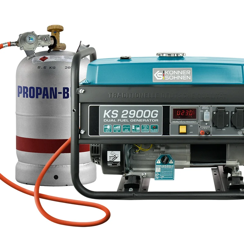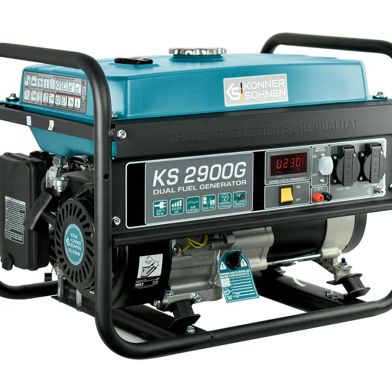 Газобензинові генератори ТМ «Könner & Söhnen» серії DUAL FUEL на сьогоднішній день найбільш популярні серед покупців через свою економічність та екологічність. Ви можете використовувати генератор як на бензині, так і на зрідженому газі (пропан-бутан). Експлуатація генератора на газу підвищує моторесурс двигуна. Все необхідне для підключення балону йде в комплекті: генератор оснащений двома редукторами та шлангом підключення; необхідно тільки під’єднати генератор до балону. Генератор не призначений для підключення до газової магістралі. При необхідності газобензинові моделі легко перемкнути на роботу на бензині. Потужний одноциліндровий 4-х тактний двигун K&S з повітряним охолодженням забезпечує стабільну та надійну роботу генератора. Переглянути відео.