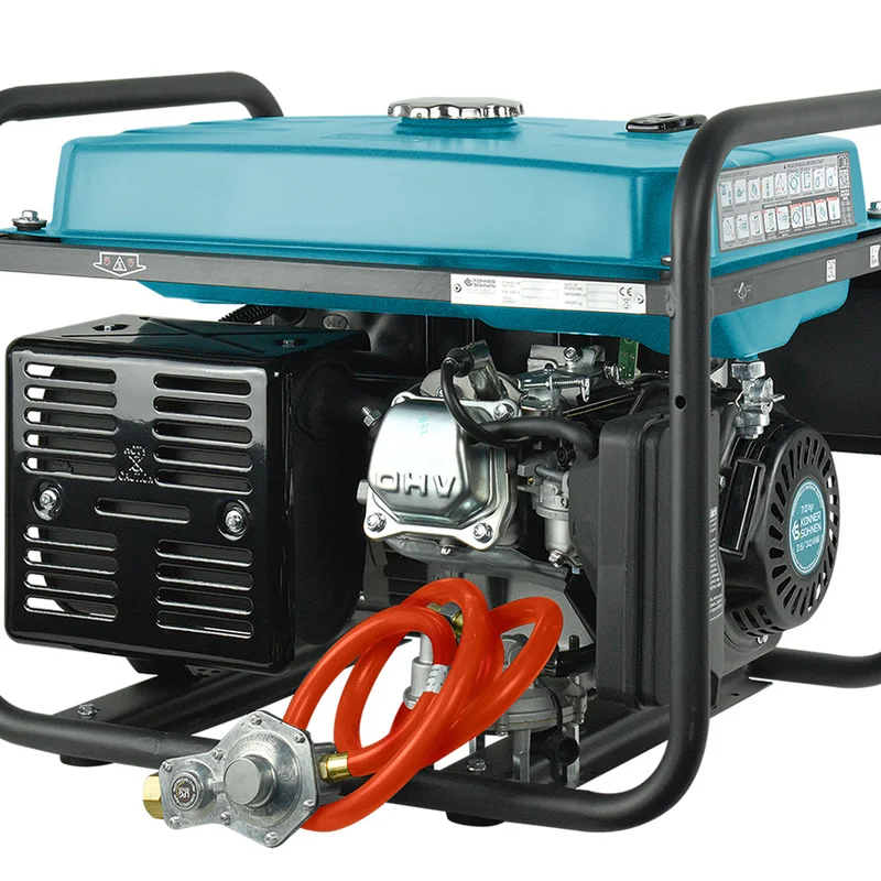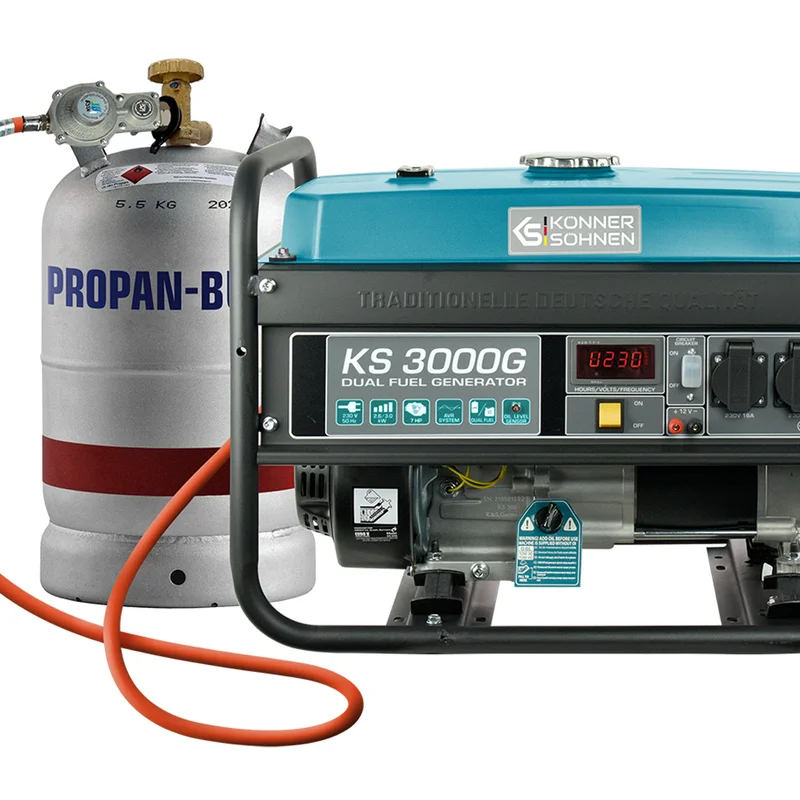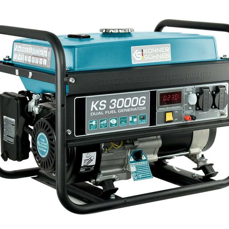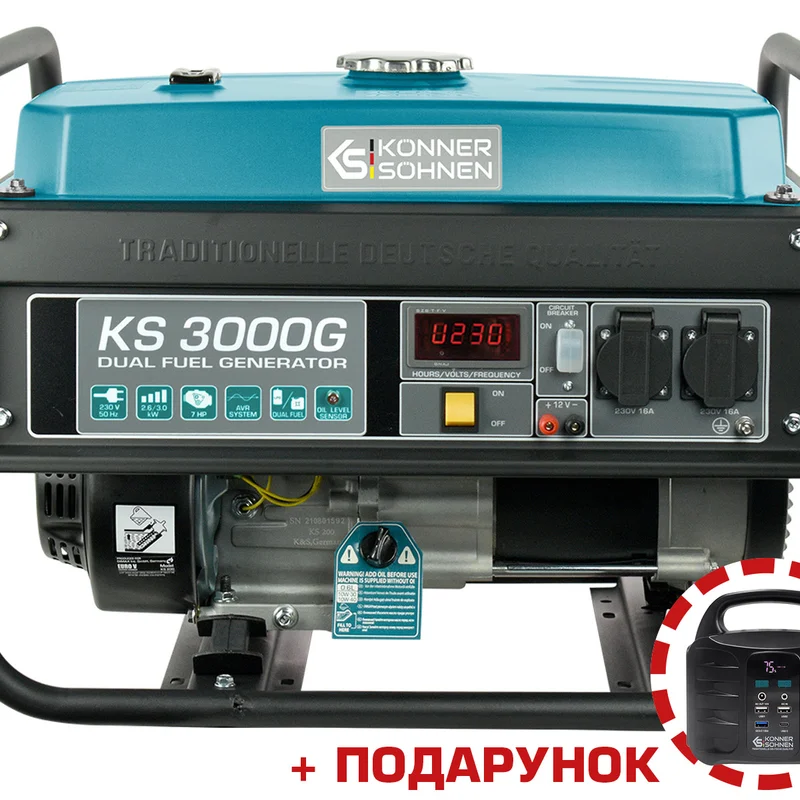 Газобензинові генератори ТМ «Könner & Söhnen» серії DUAL FUEL на сьогоднішній день найбільш популярні серед покупців через свою економічність та екологічність. Ви можете використовувати генератор як на бензині, так і на зрідженому газі (пропан-бутан). Експлуатація генератора на газу підвищує моторесурс двигуна. Все необхідне для підключення балону йде в комплекті: генератор оснащений двома редукторами та шлангом підключення; необхідно тільки під’єднати генератор до балону. Генератор не призначений для підключення до газової магістралі. При необхідності газобензинові моделі легко перемкнути на роботу на бензині. Потужний одноциліндровий 4-х тактний двигун K&S з повітряним охолодженням забезпечує стабільну та надійну роботу генератора. Переглянути відео.