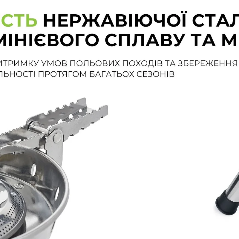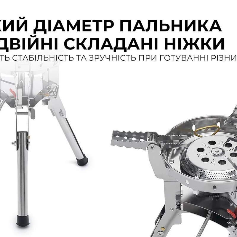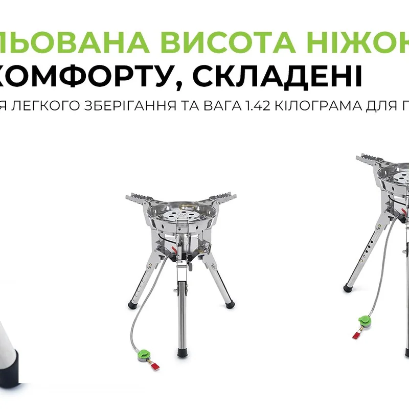 Однією з ключових переваг моделі є наявність складаних ніжок, які мають п'ять варіантів висоти. Дана особливість дозволяє регулювати висоту пальника в межах від 330 до 420 міліметрів, при цьому у складеному положенні габарити моделі становлять лише 210 х 205 міліметрів. Вага конструкції складає 1.42 кілограмів.