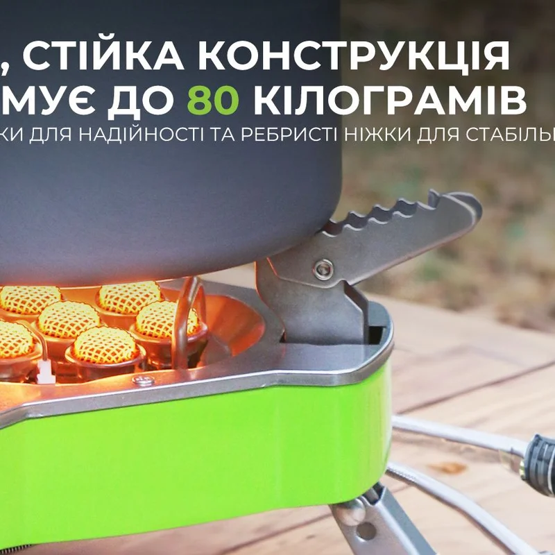 За зручність експлуатації відповідають три складані стійки для посуду та три металеві ніжки. Зубчаста кромка стійок сприяє надійному утриманню казанка на поверхні без ковзання, а ребристі ніжки підвищують стійкість конструкції незалежно від рельєфу поверхні. Після встановлення висота конструкції дорівнює 125 міліметрам, а діаметр — 265 міліметрам, тому на пальник зручно встановлюється широкий посуд підвищеного об'єму. У складеному вигляді габарити моделі становлять 210 х 95 міліметрів при вазі 1.1 кілограм.