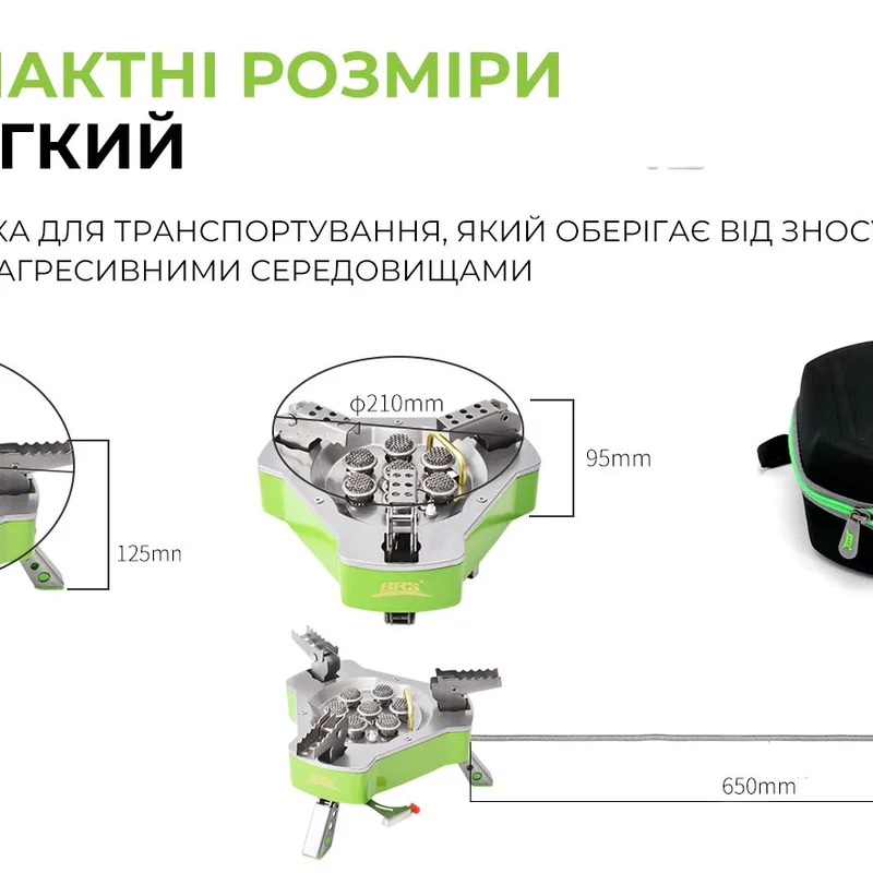 Газовий пальник BRS-71 можна переносити у рюкзаку або фірмовому чохлі-сумці, що входить до комплекту. Аксесуар виготовлений із полімеру EVA та оснащений блискавкою, оберігаючи металеву конструкцію від засмічення та контакту з агресивними середовищами під час зберігання. Дизайн чохла доповнює зручна ручка для транспортування.