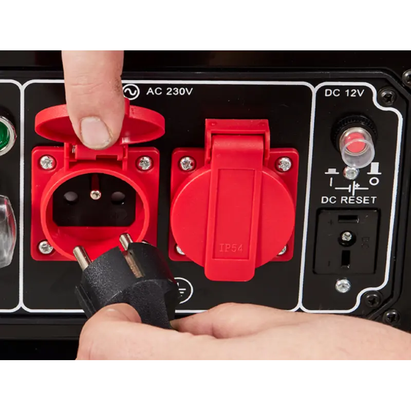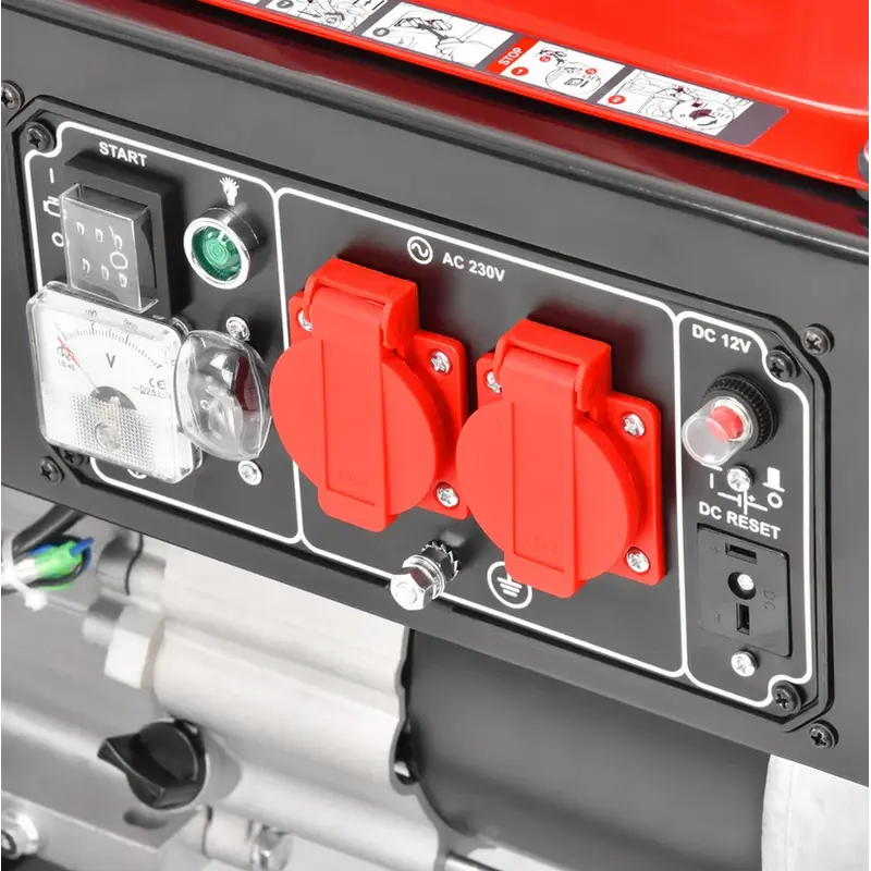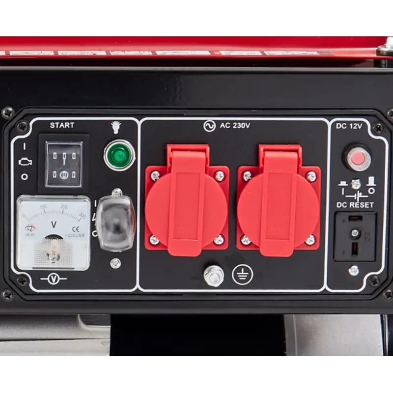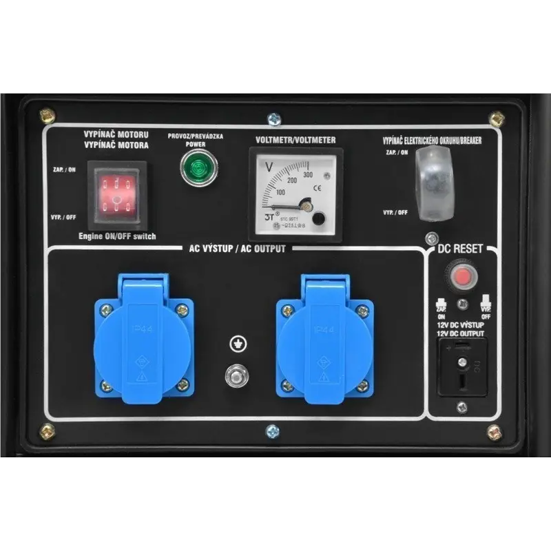 На електрощитку генератора є контрольний аналоговий вольтметр, пара класичних розеток 2x розетка 230В - 16А, 1x розетка 12В для підключення приладів 230 В/50 Гц, серед яких є і захисна клема для підключення заземлювального кабелю.