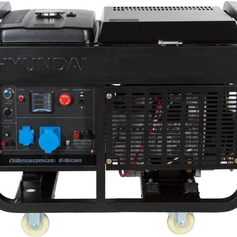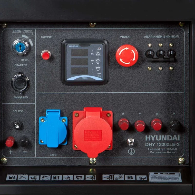Фірмовий двигун зі збільшеним моторесурсом та потужністю: Збільшена зносостійкість блока циліндрів, що дозволило збільшити моторесурс двигуна до 3500 мотогодин без капітального ремонту; Використання якісних матеріалів в поєднанні з надійною системою фіксації клапанів, що гарантує надійну та довговічну роботу двигуна; Надійний масляний насос завжди забезпечує бездоганне змащування поршневої групи; Високоякісний повітряний фільтр забезпечує надійну фільтрацію повітря для утворення паливної суміші. Система запуску EASY START - використовується автоматично для полегшеного запуску генератора. Альтернатор - усі генератори Hyundai комплектуються тільки синхронними альтернаторами з мідною обмоткою. Обмотка з міді не перегрівається, витримує більші навантаження у порівнянні з іншими матеріалами, володіє відмінною струмовіддачею. Виготовляються на автоматичній лінії, що унеможливлює присутність дефектів пов’язаних з людським фактором, також застосовано поліпшене укладання проводів з додатковою фіксацією обмоток та якісною лаковою заливкою проводів. Балансування ротора проводиться під динамічним навантаженням на високоточному обладнанні із застосуванням електронної системи вимірювання симетрії. Також в дизельних генераторах даної серії використана система подвійного захисту обмоток альтернатора від перевантаження. Панель керування генератора - повністю оновлений багатофункціональний цифровий дисплей є не тільки інформаційним, а в першу чергу виконує функцію надійного захисту генератора від перевантажень, та захищає під’єднані до генератора споживачів, від таких неприємностей як, стрибки напруги, струму, частоти, навіть попереджує користувача про низький заряд акумулятора. На панелі керування встановлено: 1. Цифровий дисплей нового покоління надає інформацію про: 1.1 Захист - новий цифровий дисплей захищає від: напругу (V); струм (А); частоту (Hz); загальні мотогодини; стан акумулятора; температуру навколишнього середовища; температуру двигуна; режим роботи (автоматичний / ручний); помилки в стані роботи генератора. Перевантаження; Надвисого струму; Відхилення частоти (високої чи низької); Відхилення напруги (високої чи низької); Відхилення напруги акумулятора (високої чи низької). 1.2 Керування: Кнопка перемикання режимів роботи (автоматичний / ручний); Кнопка запуску генератора; Кнопка зупинки генератора; Кнопка входу до меню налаштувань; 4 кнопки зі стрілками для навігації в системі перегляду даних та налаштування. 2. Силові контакти для підключення повного навантаження потужністю 11кВт (для 220В) 13,75кВА (для 380В); 3. Для 380В - розетка 400В/32А та розетка 230В/16А; 4. Вихід 12 V (з тепловим запобіжником від перевантаження); 5. Замок запалення; 6. Тепловий захист звичайної розетки (16А); 7. Вихід для під’єднання заземлення; 8. Кнопка аварійної зупинки двигуна; 9. Кнопка ввімкнення свічки розжарення; 10. Роз'єм підключення блоку ATS. AVR - виготовлена серійно, встановлені конденсатори підвищеної ємкості, та герметично заповнена компаундом для захисту від зовнішнього середовища. Інтелектуальна система захисту - створює оптимальні умови використання джерела струму в робочому діапазоні. Гарантовано генерує максимально вказану потужність. Система поліпшення запуску двигуна у зимовий період - встановлена на всіх генераторах даної серії. Підігрів п