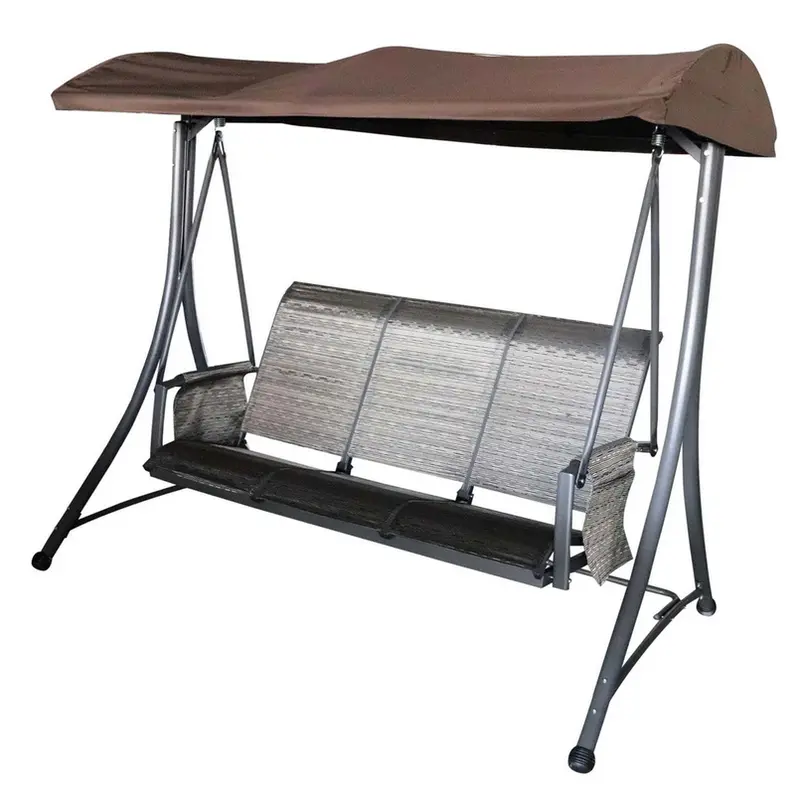 Міцна садова тримісна лавка-гойдалка з навісом, виготовлена із сталевих труб з комакситовою обробкою поверхні. Лавка підвішена на гвинтових пружинах. Підходить для закритих садових ділянок. Не підходить для використання у вологому середовищі. Розміри: (Д x Ш x В): 123 x 196 x 179 см. Вантажопідйомність: 250 кг.