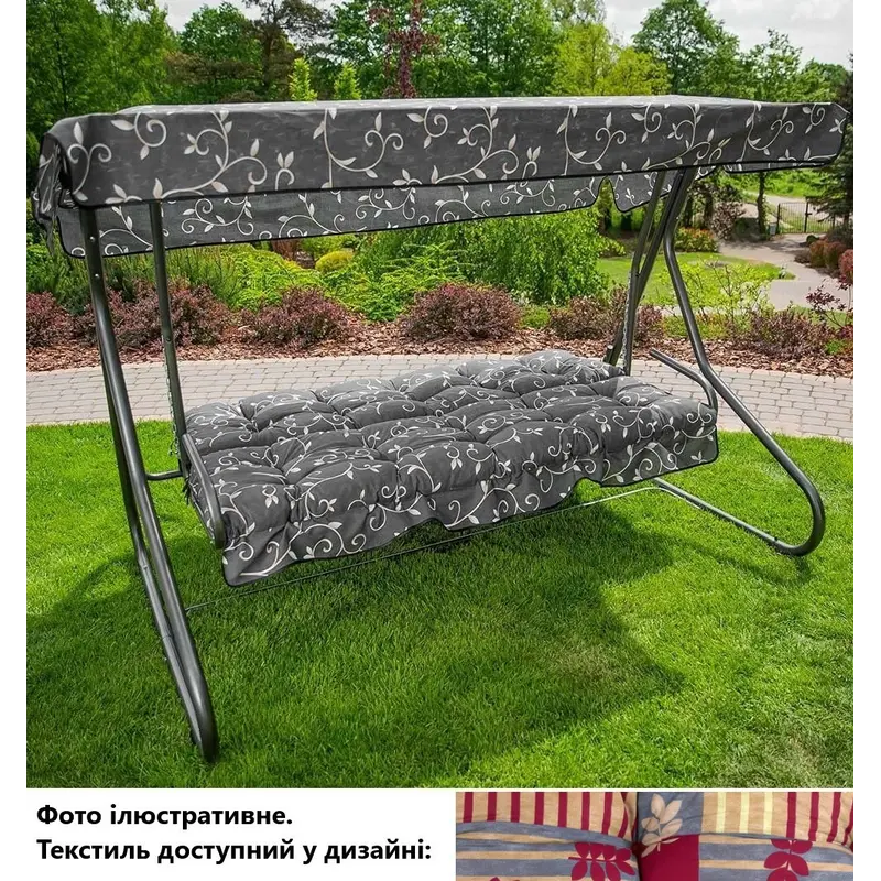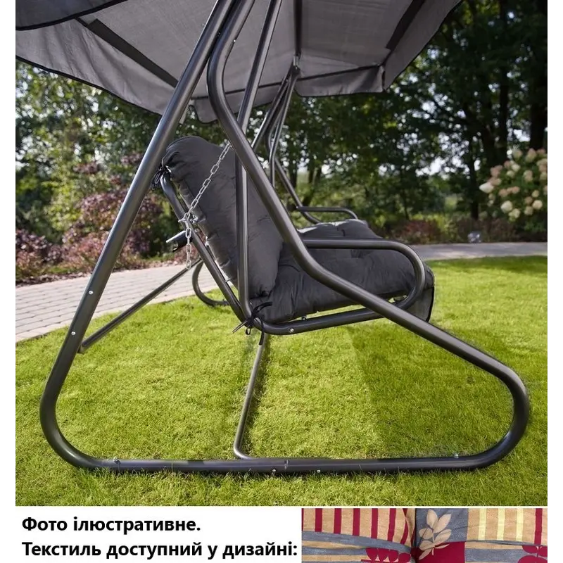 Стійкий дугоподібний каркас, виготовлений із якісної сталі з порошковим покриттям кольору антрацит, забезпечує тривалий термін служби виробу. Подушки-сидіння виконані у текстилі з геометрично-рослинним принтом червоно-сірих відтінків, а навіс у червоному кольорі, завдяки чому гойдалка буде чудовим акцентом у дизайні саду, тераси або веранди. Декоративна оборка на нижній частині подушки-сидіння додає особливої грайливості виробу.
