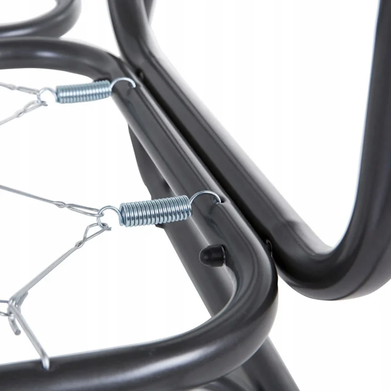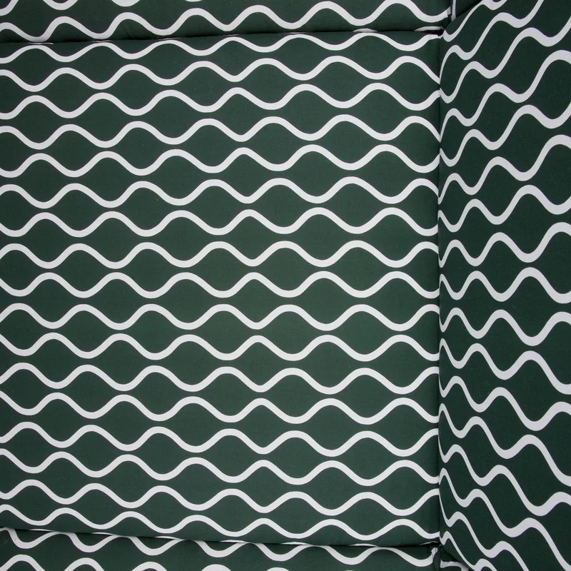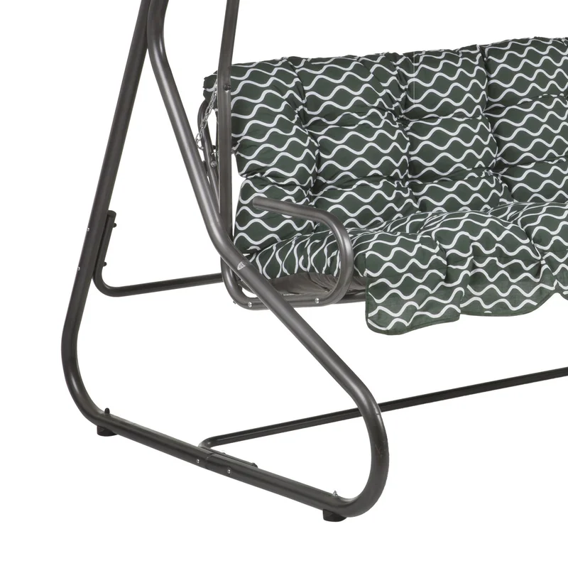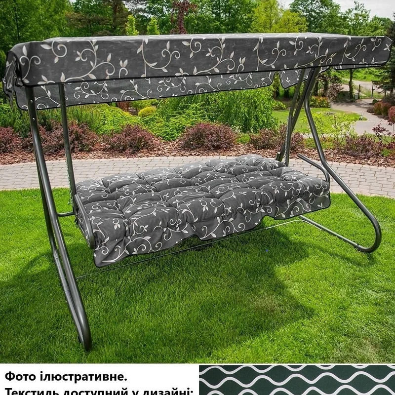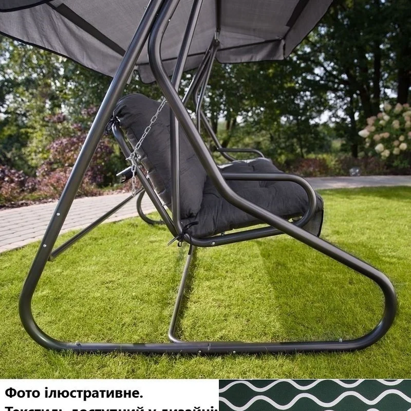 Стійкий дугоподібний каркас, виготовлений із якісної сталі з порошковим покриттям кольору антрацит, забезпечує тривалий термін служби виробу. Подушки-сидіння виконані у текстилі смарагдового відтінку із контрастним хвилястим принтом білого кольору, а навіс в універсальному чорному, завдяки чому гойдалка буде чудовим акцентом у дизайні саду, тераси або веранди. Декоративна оборка на нижній частині подушки-сидіння додає особливої грайливості виробу.
